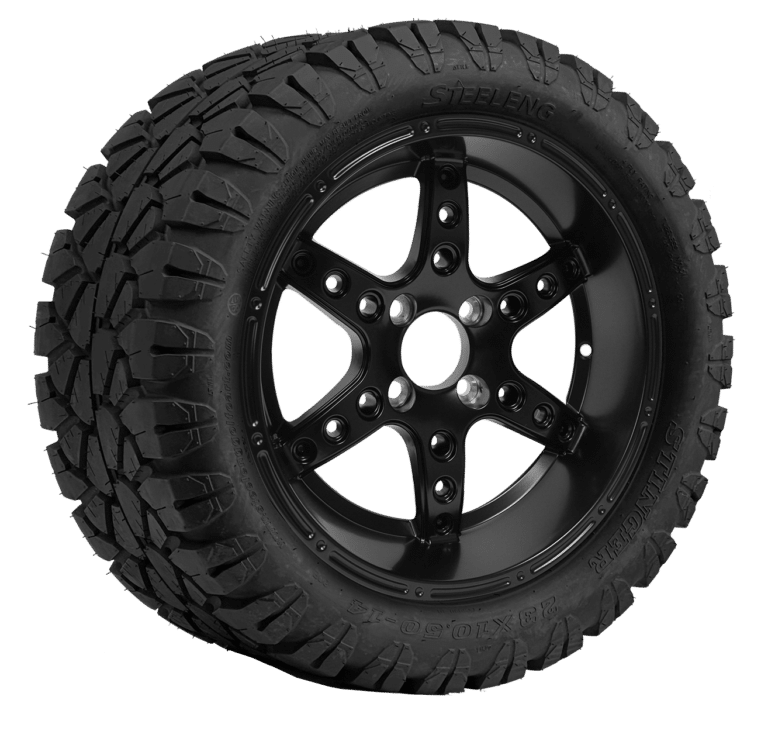 BNDL-TR1405-WH1412-CC0003-LN – SGC 14″ Turbine Matte Black Wheel – Aluminum Alloy / STEELENG 23″x10.5″-14″ STINGER Hybrid AT Tire DOT approvedIn Stock