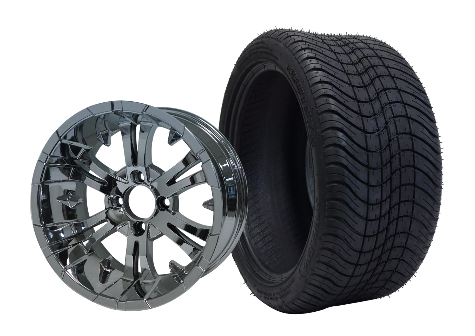 BNDL-TR1404-WH1415-LN0001-CC0001 – SGC 14″ Vampire Chrome Wheel – Aluminum Alloy / STEELENG 205/30-14 Low Profile Tire DOT approvedOut of Stock – Notify Me!