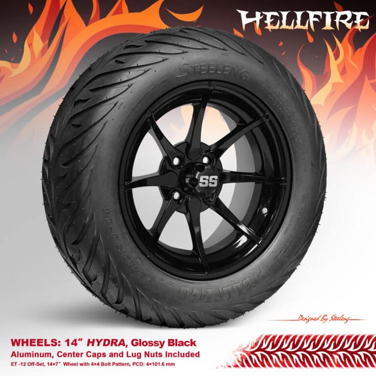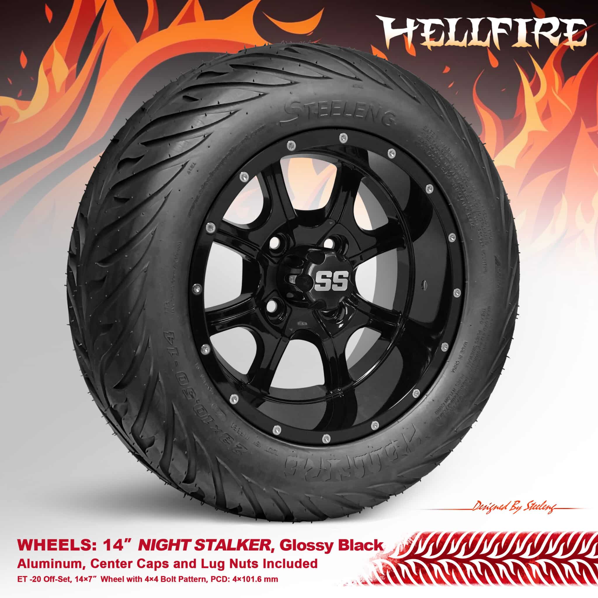 BNDL-TR1406-WH1403-CC0002-LN – SGC 14″ Night Stalker Glossy Black Wheel – Aluminum Alloy / STEELENG 23″x10.5″-14″ HELLFIRE Street Tire DOT approvedOut of Stock – Notify Me!