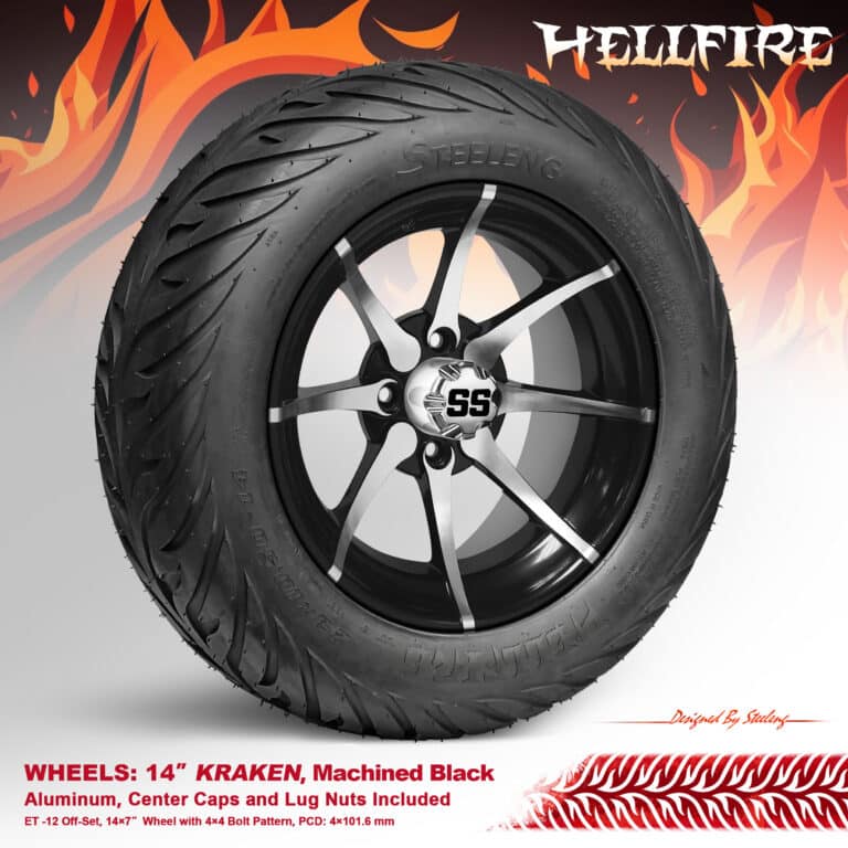 BNDL-TR1406-WH1402-CC0001-LN – SGC 14″ Kraken Machined/Black Wheel – Aluminum Alloy / STEELENG 23″x10.5″-14″ HELLFIRE Street Tire DOT approvedIn Stock