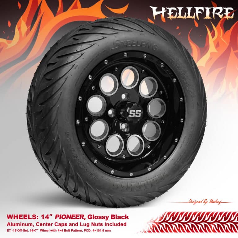 BNDL-TR1406-WH1404-CC0002-LN – SGC 14″ Pioneer Glossy Black Wheel – Aluminum Alloy / STEELENG 23″x10.5″-14″ HELLFIRE Street Tire DOT approvedIn Stock