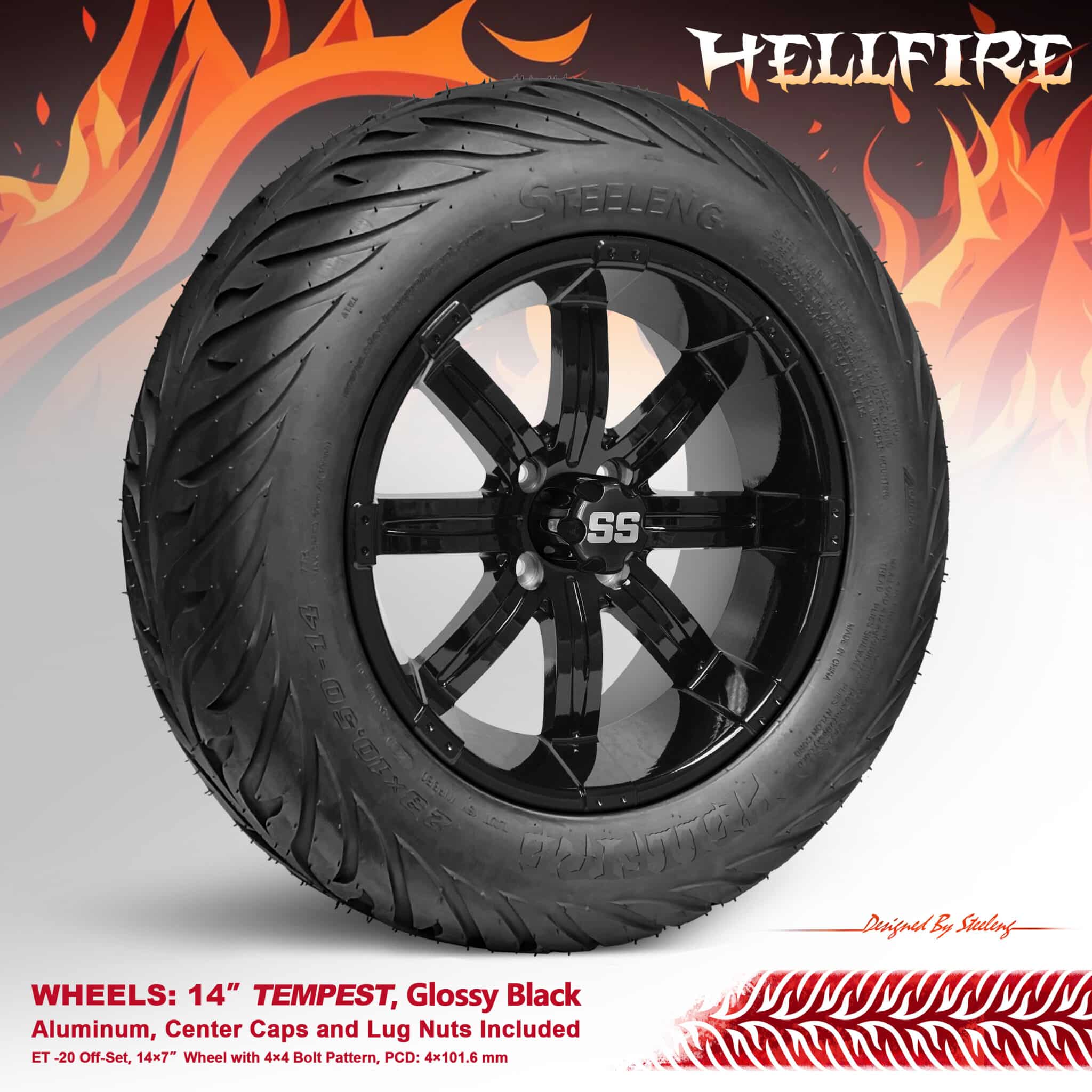 BNDL-TR1406-WH1407-CC0002-LN – SGC 14″ Tempest Glossy Black Wheel – Aluminum Alloy / STEELENG 23″x10.5″-14″ HELLFIRE Street Tire DOT approvedIn Stock