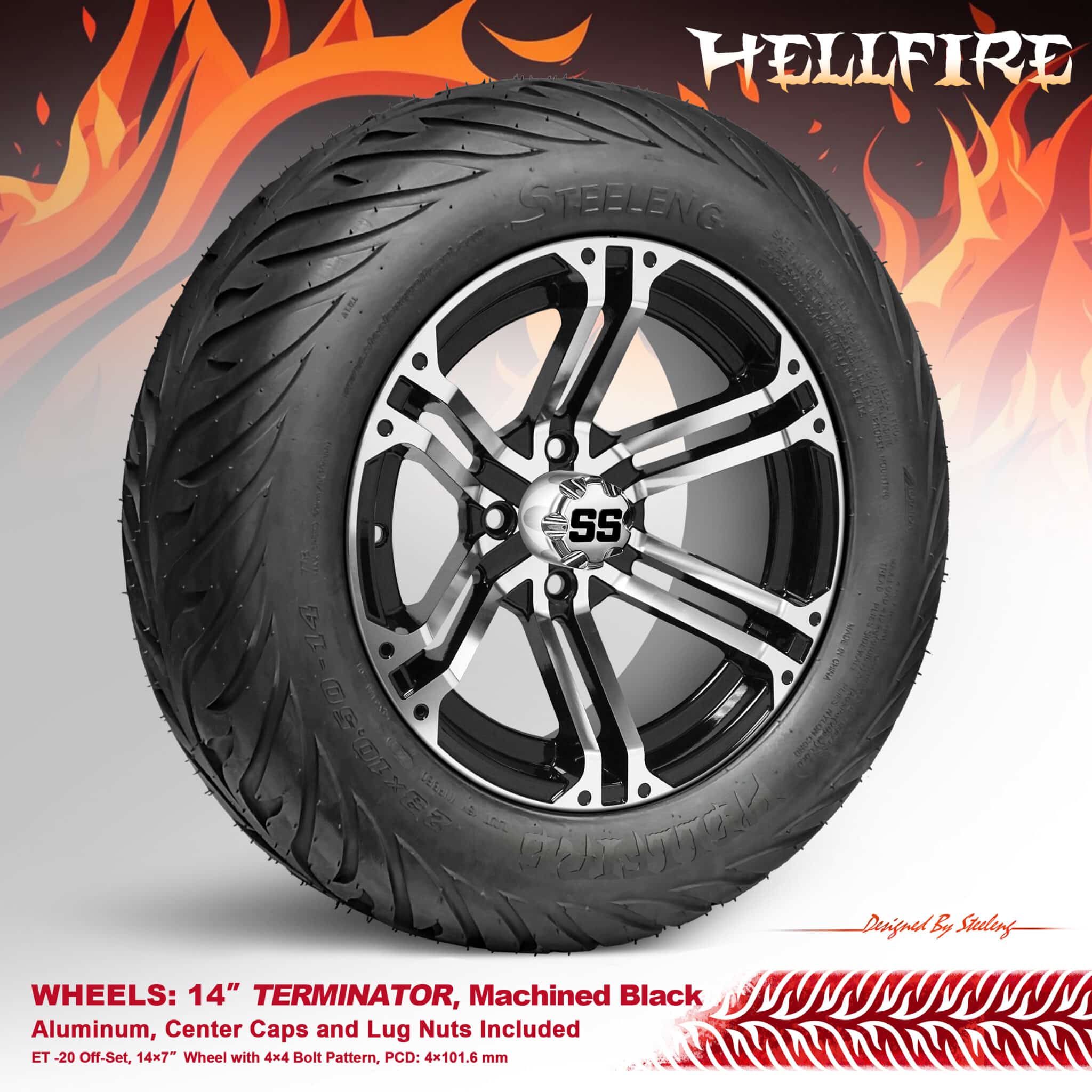 BNDL-TR1406-WH1409-CC0001-LN – SGC 14″ Terminator Machined/Black Wheel – Aluminum Alloy / STEELENG 23″x10.5″-14″ HELLFIRE Street Tire DOT approvedIn Stock