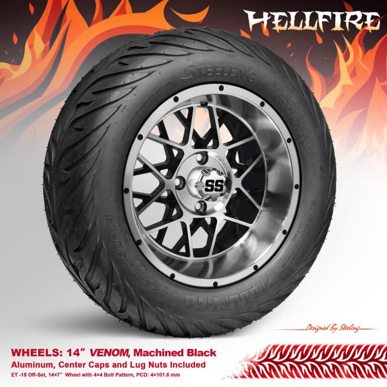 BNDL-TR1406-WH1419-CC0001-LN – SGC 14″ Venom Machined/Black Wheel – Aluminum Alloy / STEELENG 23″x10.5″-14″ HELLFIRE Street Tire DOT approvedIn Stock