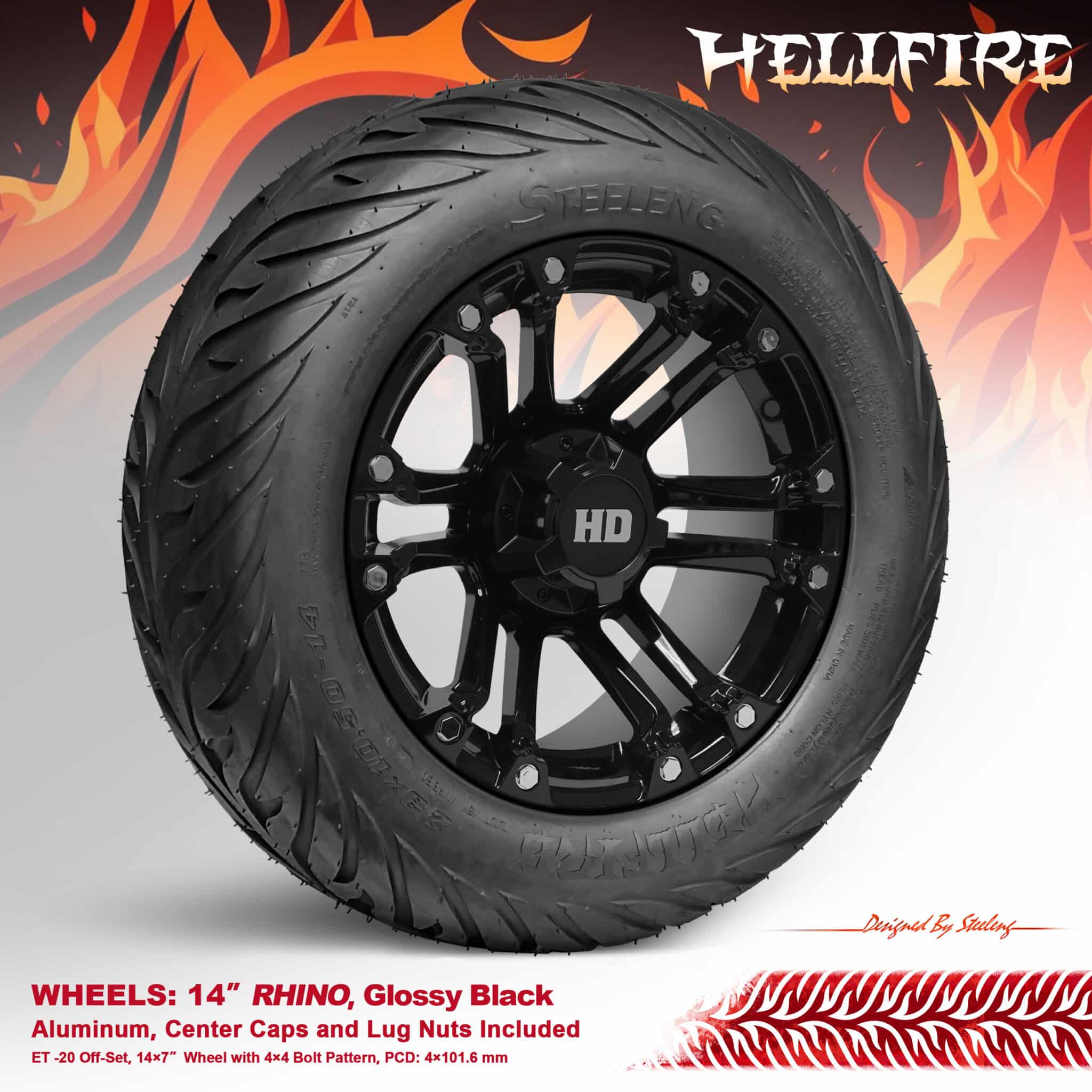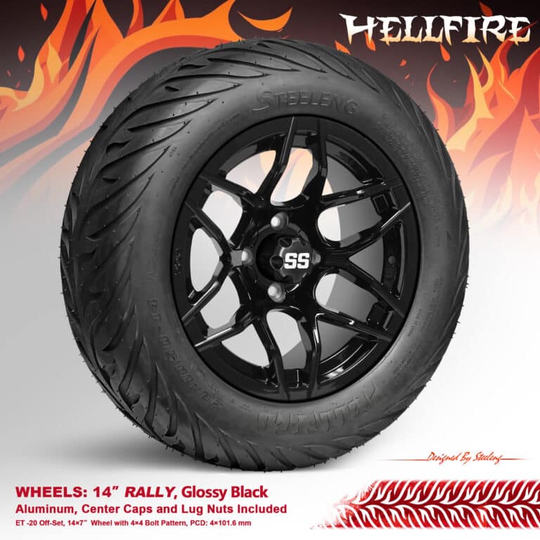 BNDL-TR1406-WH1411-CC0002-LN – SGC 14″ Turbine Glossy Black Wheel – Aluminum Alloy / STEELENG 23″x10.5″-14″ HELLFIRE Street Tire DOT approvedIn Stock