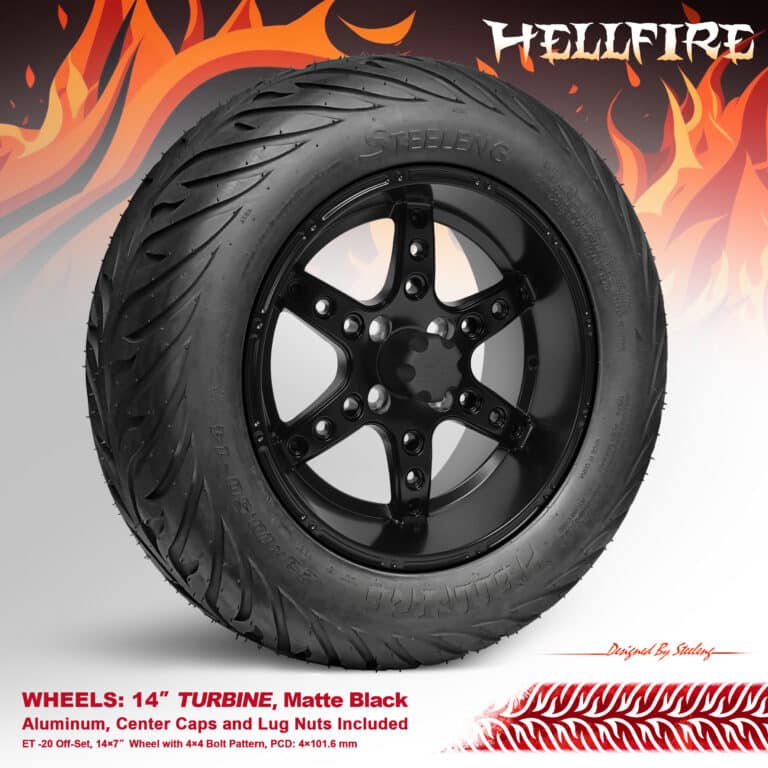 BNDL-TR1406-WH1412-CC0003-LN – SGC 14″ Turbine Matte Black Wheel – Aluminum Alloy / STEELENG 23″x10.5″-14″ HELLFIRE Street Tire DOT approvedIn Stock