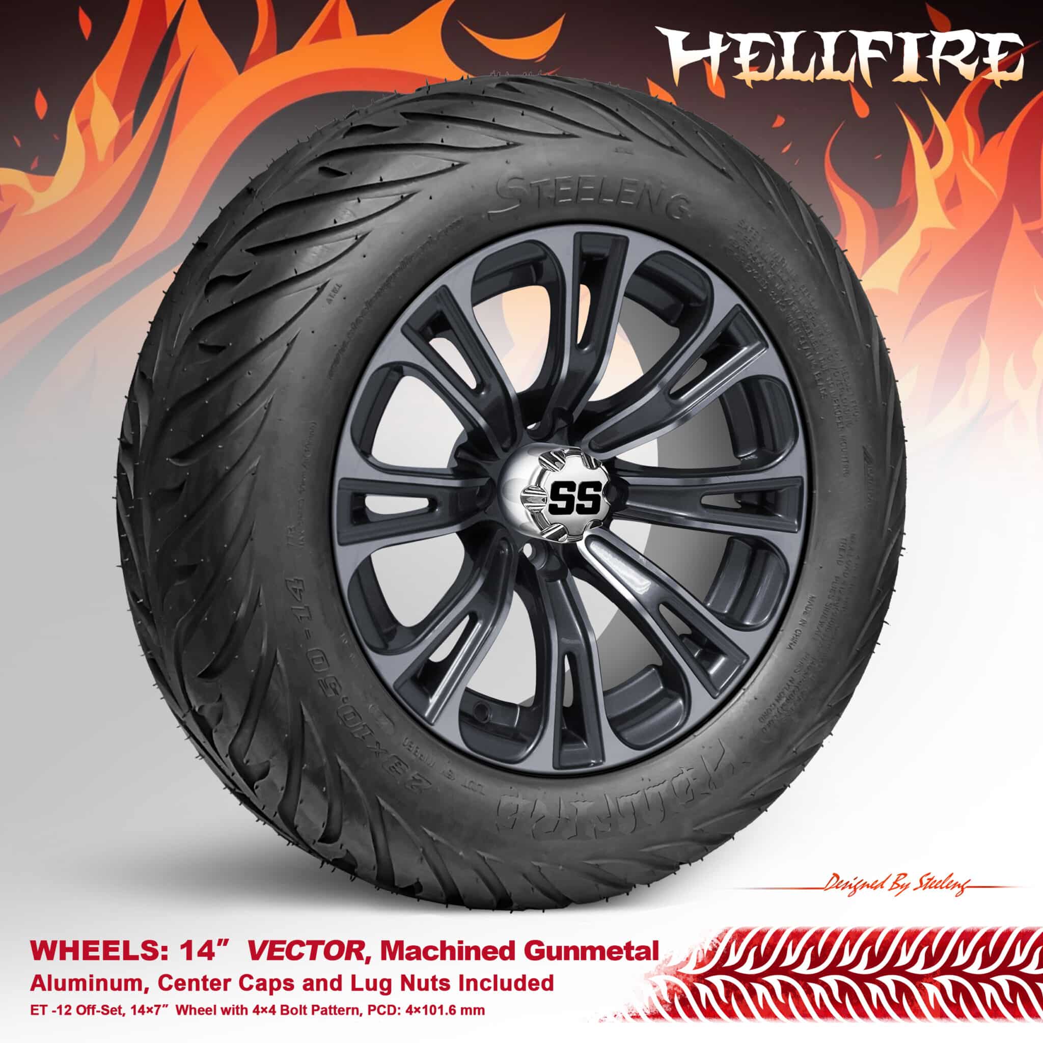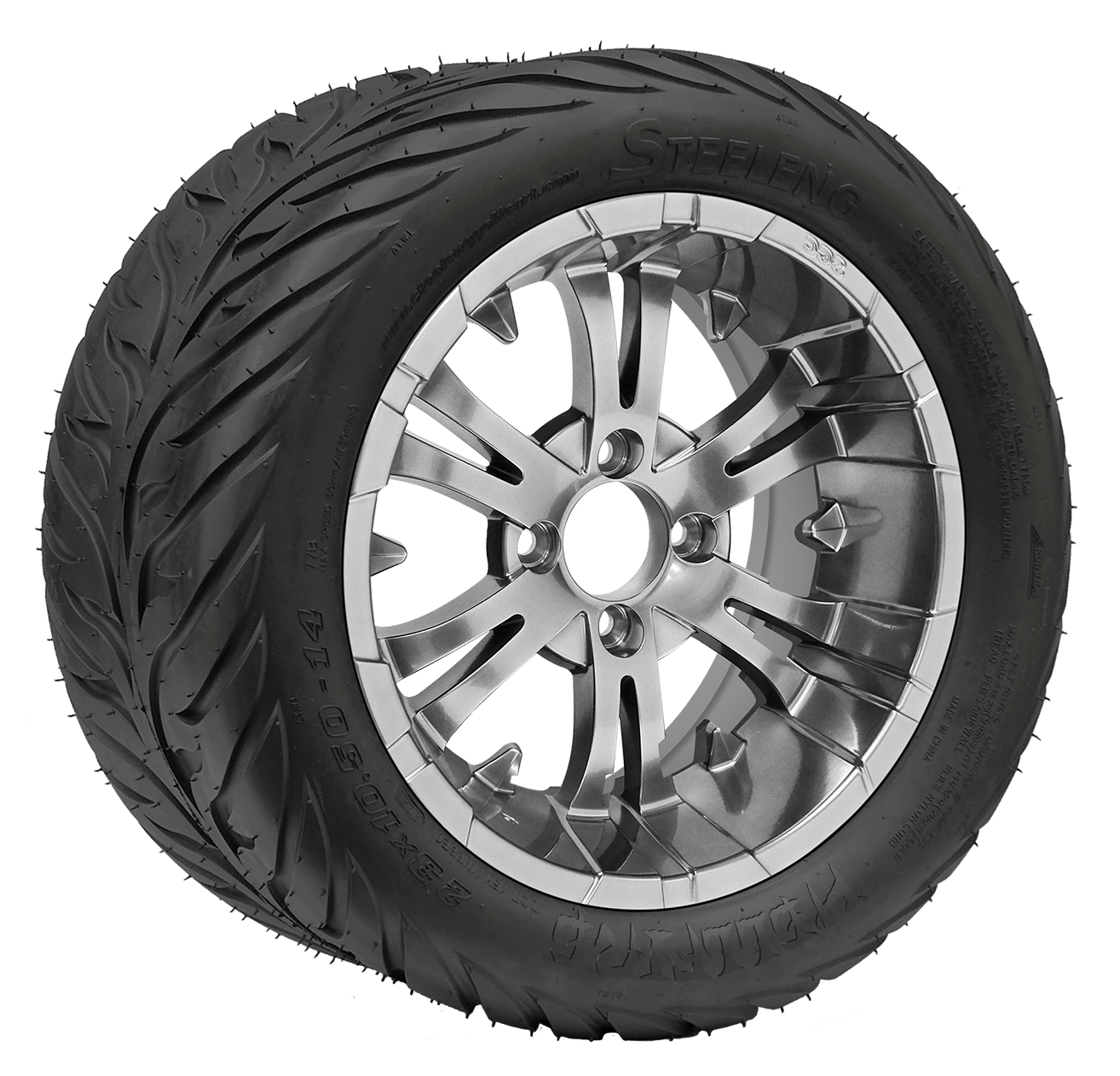 BNDL-TR1406-WH1417-CC0001-LN – SGC 14″ Vector Machined/Gunmetal Wheel – Aluminum Alloy / STEELENG 23″x10.5″-14″ HELLFIRE Street Tire DOT approvedIn Stock