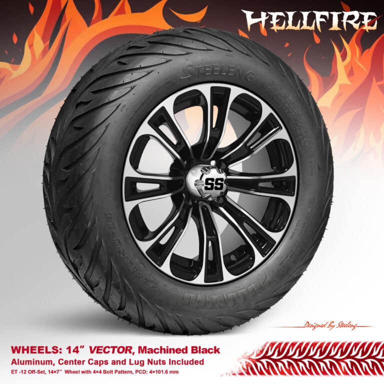 BNDL-TR1406-WH1418-CC0001-LN – SGC 14″ Vector Machined/Black Wheel – Aluminum Alloy / STEELENG 23″x10.5″-14″ HELLFIRE Street Tire DOT approvedIn Stock