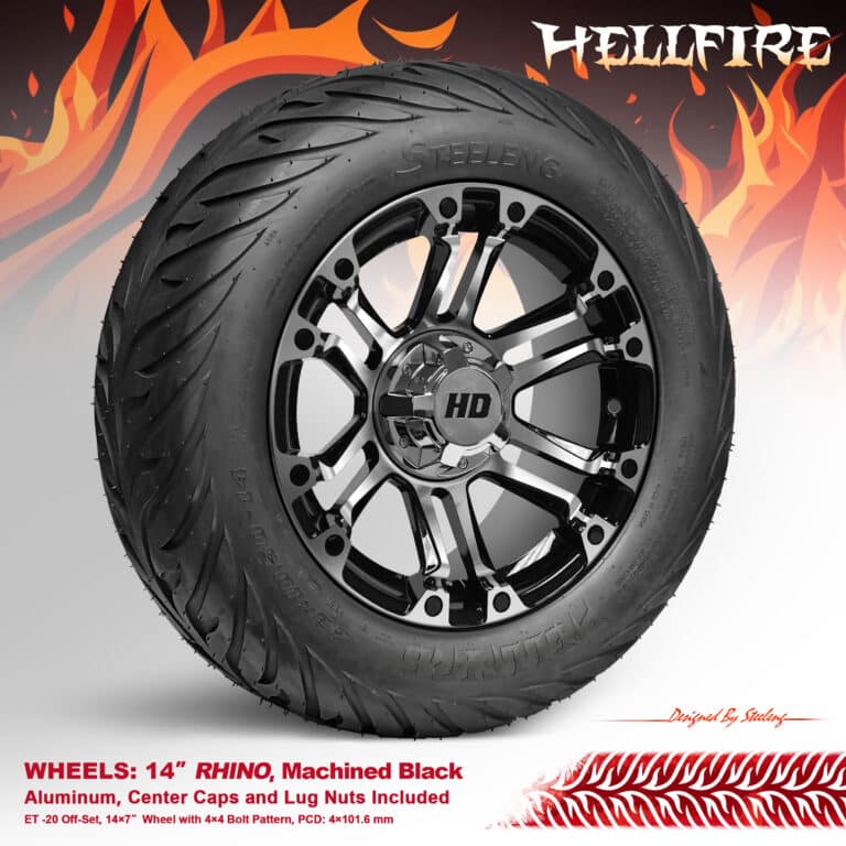 BNDL-TR1406-WH1422-CC0008-LN – SGC 14″ Rhino Machined/Black Wheel – Aluminum Alloy / STEELENG 23″x10.5″-14″ HELLFIRE Street Tire DOT approvedIn Stock