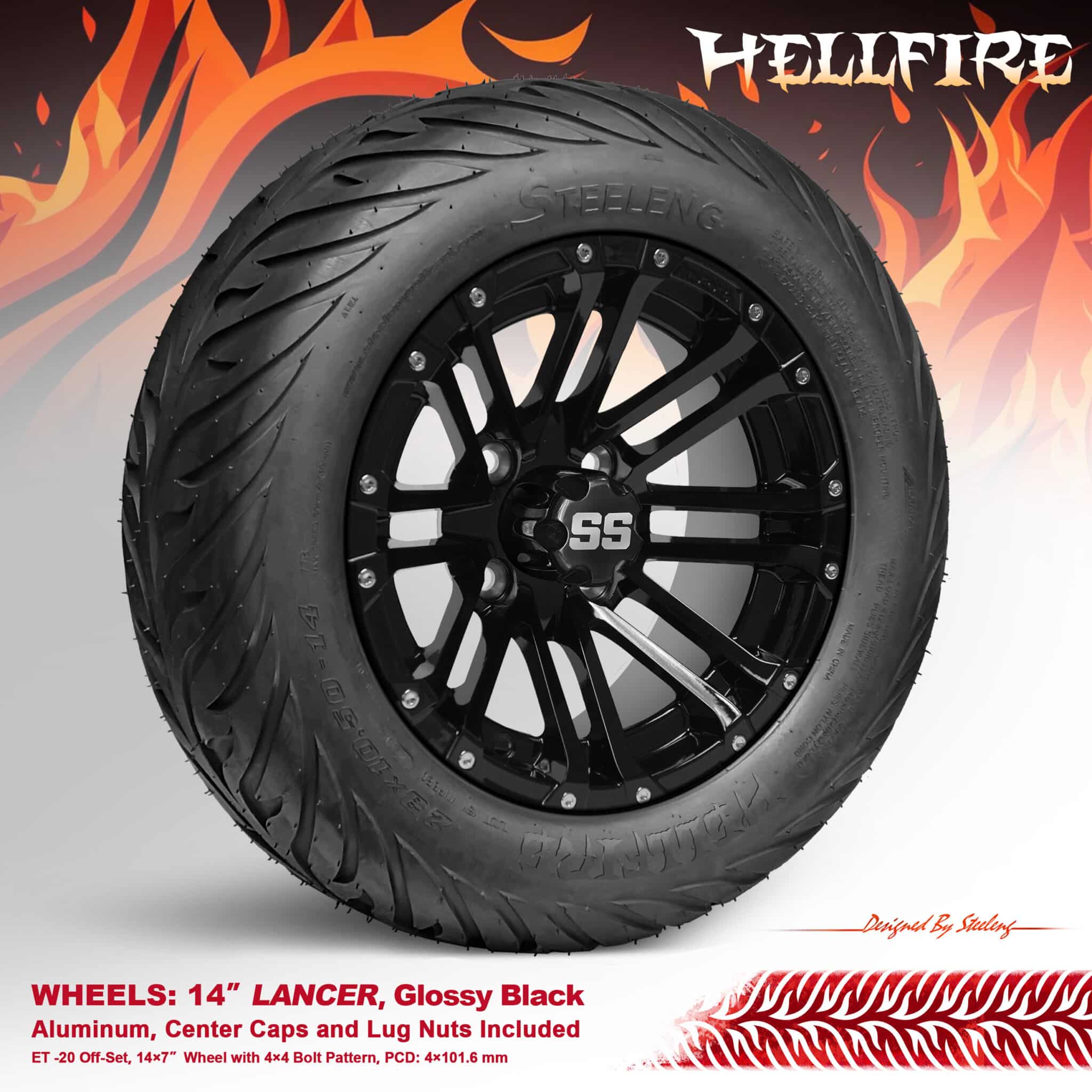 BNDL-TR1406-WH1425-CC0002-LN – SGC 14″ Lancer Glossy Black Wheel – Aluminum Alloy / STEELENG 23″x10.5″-14″ HELLFIRE Street Tire DOT approvedIn Stock