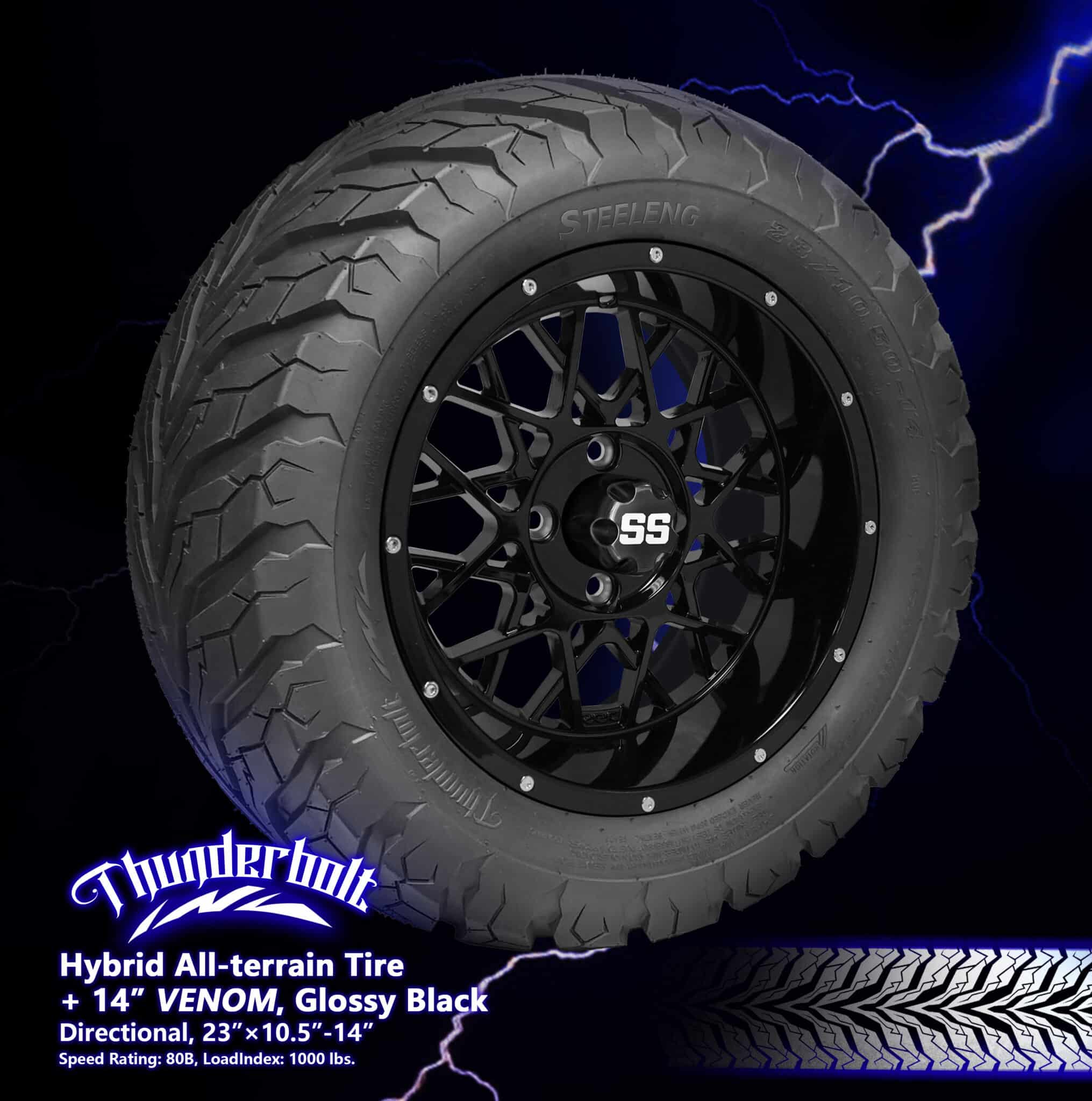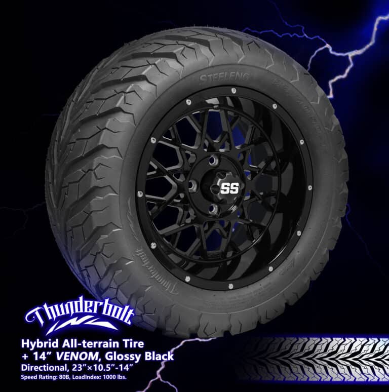 BNDL-TR1407-WH1420-CC0002-LN – SGC 14″ Venom Glossy Black Wheel – Aluminum Alloy / STEELENG 23″x10.5″-14″ Thunder Bolt Hybrid TireOut of Stock – Notify Me!