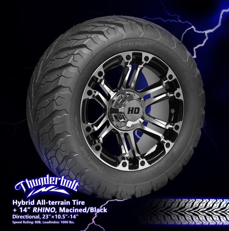 BNDL-TR1407-WH1422-CC0008-LN – SGC 14″ Rhino Machined/Black Wheel – Aluminum Alloy / STEELENG 23″x10.5″-14″ Thunder Bolt Hybrid TireOut of Stock – Notify Me!