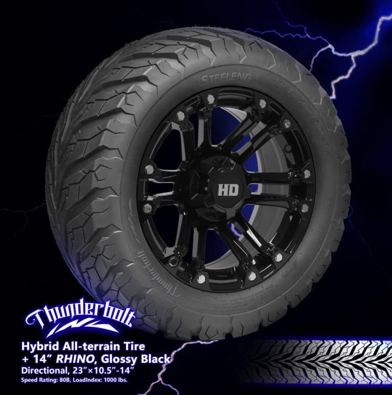 BNDL-TR1407-WH1423-LN-CC0007 – SGC 14″ Rhino Glossy Black Wheel – Aluminum Alloy / STEELENG 23″x10.5″-14″ Thunder Bolt Hybrid TireOut of Stock – Notify Me!
