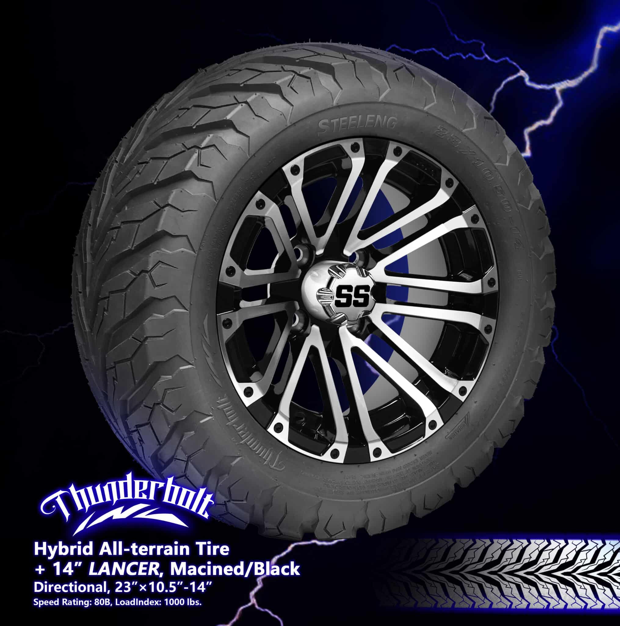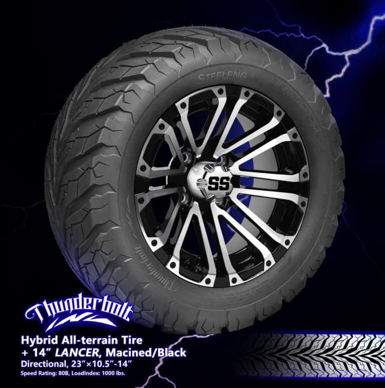 BNDL-TR1407-WH1424-LN0004-CC0001 – SGC 14″ Lancer Machined/Black Wheel – Aluminum Alloy / STEELENG 23″x10.5″-14″ Thunder Bolt Hybrid TireOut of Stock – Notify Me!