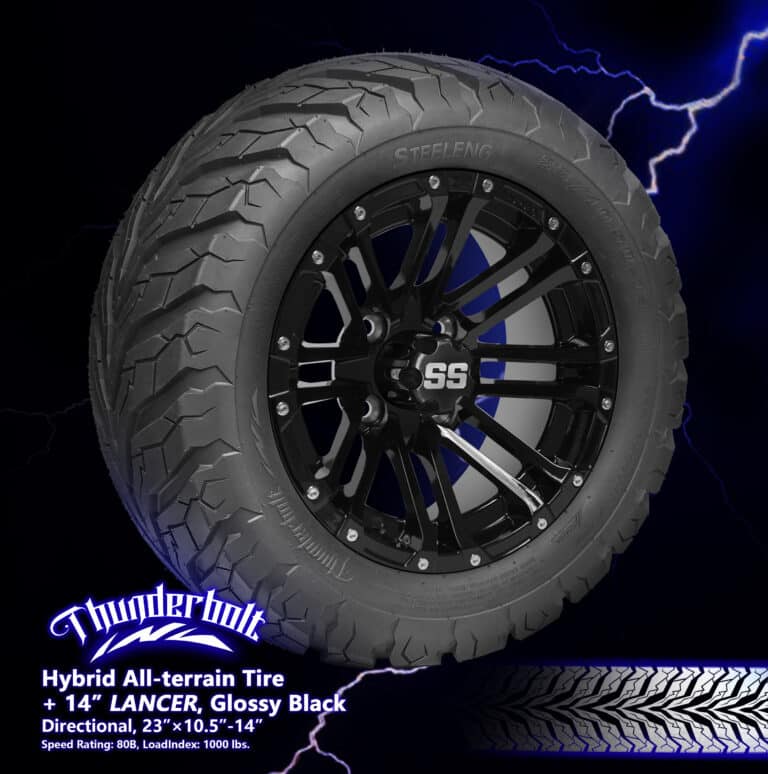 BNDL-TR1407-WH1425-CC0002-LN – SGC 14″ Lancer Glossy Black Wheel – Aluminum Alloy / STEELENG 23″x10.5″-14″ Thunder Bolt Hybrid TireOut of Stock – Notify Me!
