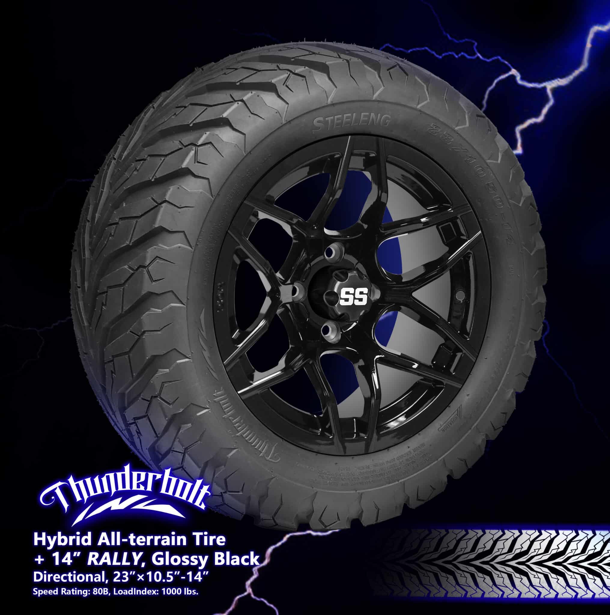 BNDL-TR1407-WH1427-CC0002-LN – SGC 14″ Rally Glossy Black Wheel – Aluminum Alloy / STEELENG 23″x10.5″-14″ Thunder Bolt Hybrid TireOut of Stock – Notify Me!