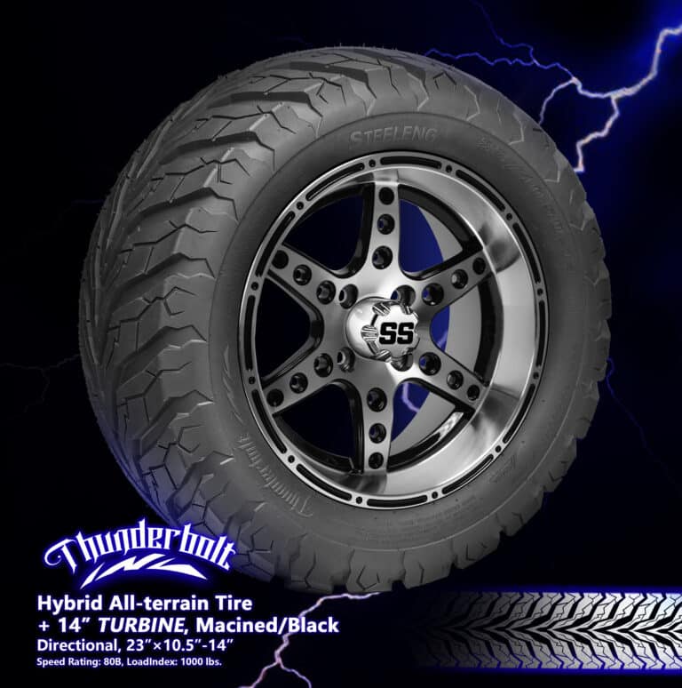 BNDL-TR1407-WH1428-CC0001-LN – SGC 14″ Turbine Machined/Black Wheel – Aluminum Alloy / STEELENG 23″x10.5″-14″ Thunder Bolt Hybrid TireOut of Stock – Notify Me!