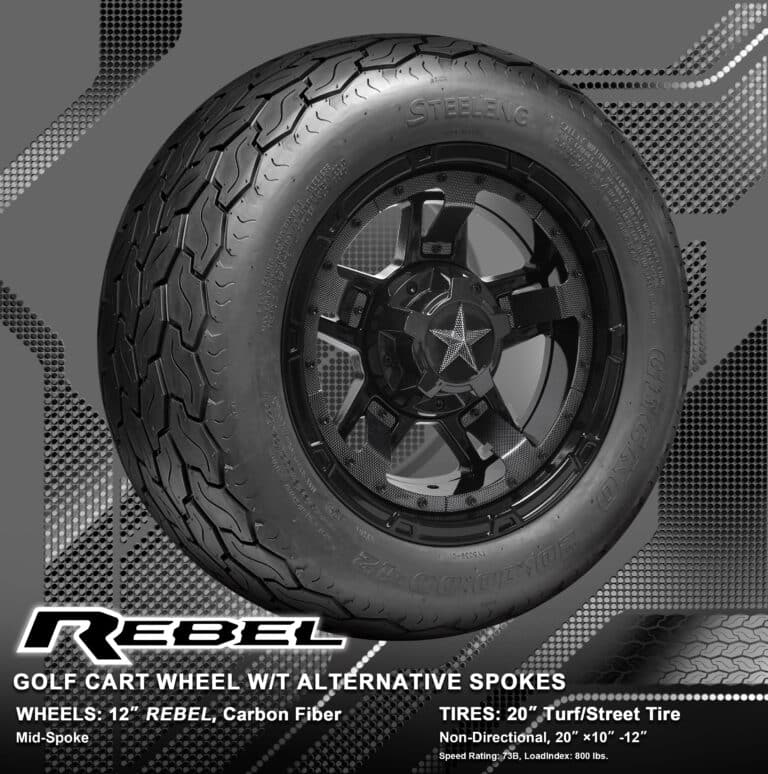 BNDL-TR1201-WH1251-WIRB01-LN0002 – SGC 12″ REBEL Glossy Black Wheel – Aluminum Alloy / STEELENG 20″x10″-12″ GECKO Street Tire / REBEL Inserts-Mid Spoke-Carbon Fiber