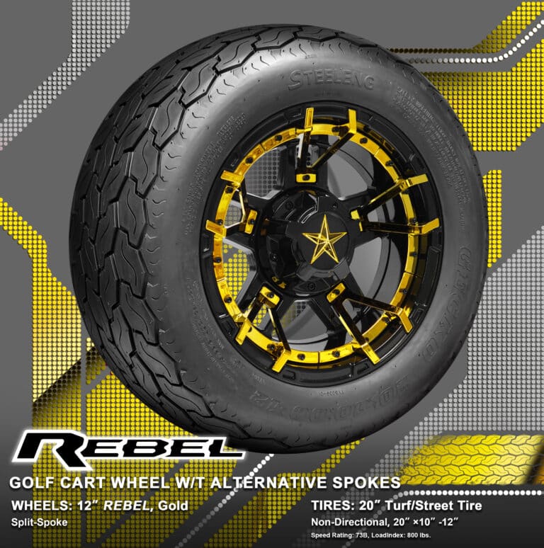 BNDL-TR1201-WH1251-WIRB38-LN0002 – SGC 12″ REBEL Glossy Black Wheel – Aluminum Alloy / STEELENG 20″x10″-12″ GECKO Street Tire / REBEL Inserts-Split Spoke-Gold