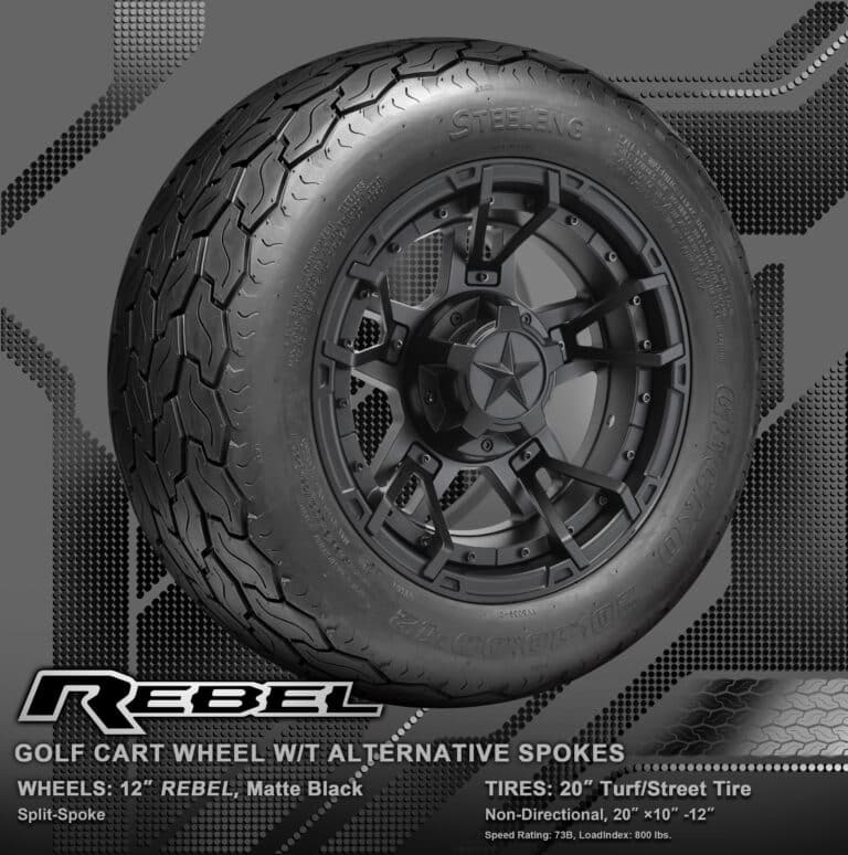BNDL-TR1201-WH1251-WIRB39-LN0002 – SGC 12″ REBEL Glossy Black Wheel – Aluminum Alloy / STEELENG 20″x10″-12″ GECKO Street Tire / REBEL Inserts-Split Spoke-Matte Black