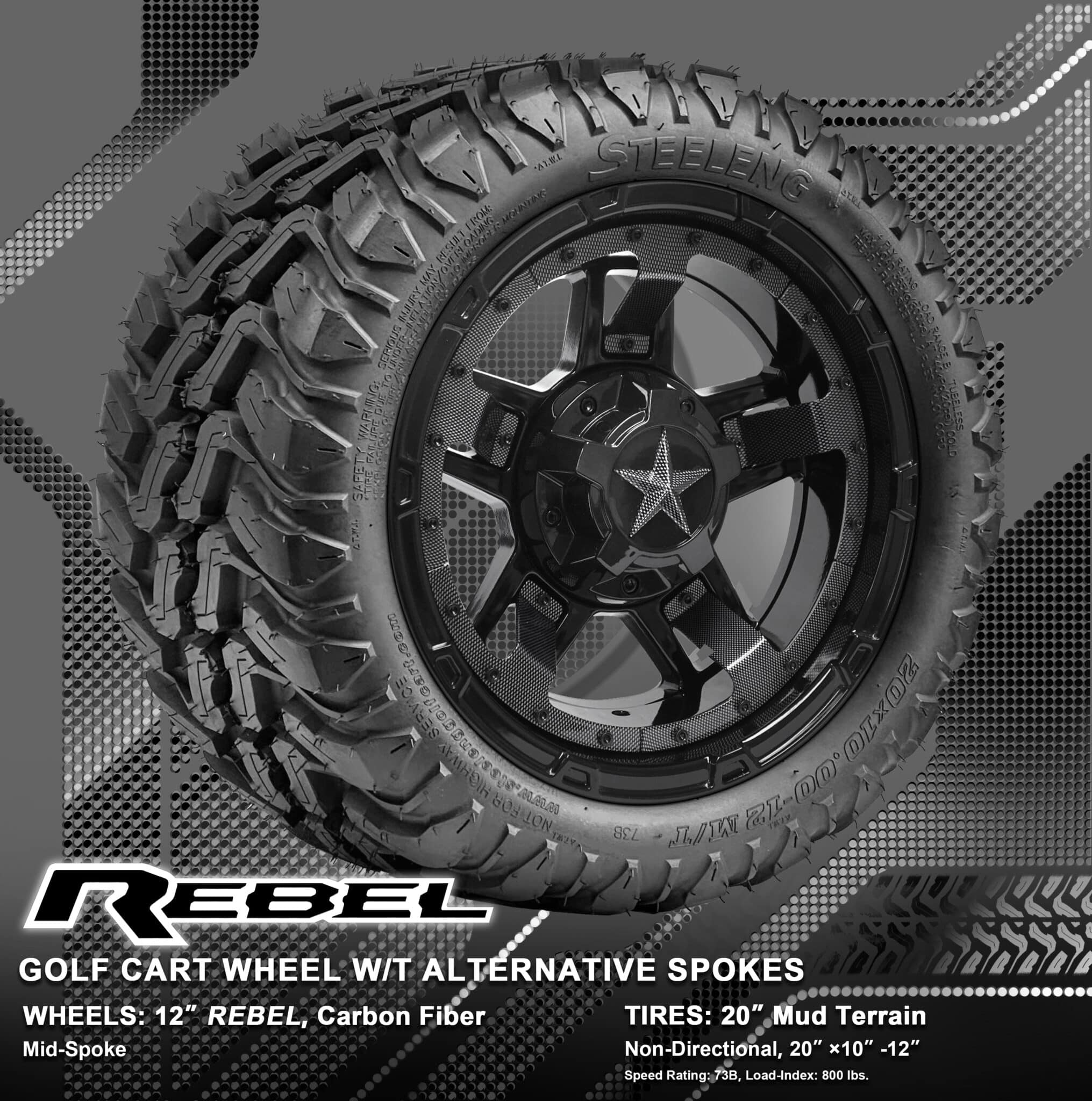 BNDL-TR1202-WH1251-WIRB01-LN0002 – SGC 12″ REBEL Glossy Black Wheel – Aluminum Alloy / STEELENG 20″x10″-12″ Mud Terrain Tire / REBEL Inserts-Mid Spoke-Carbon Fiber