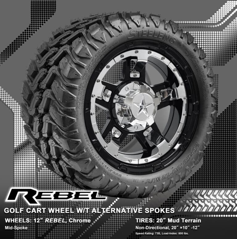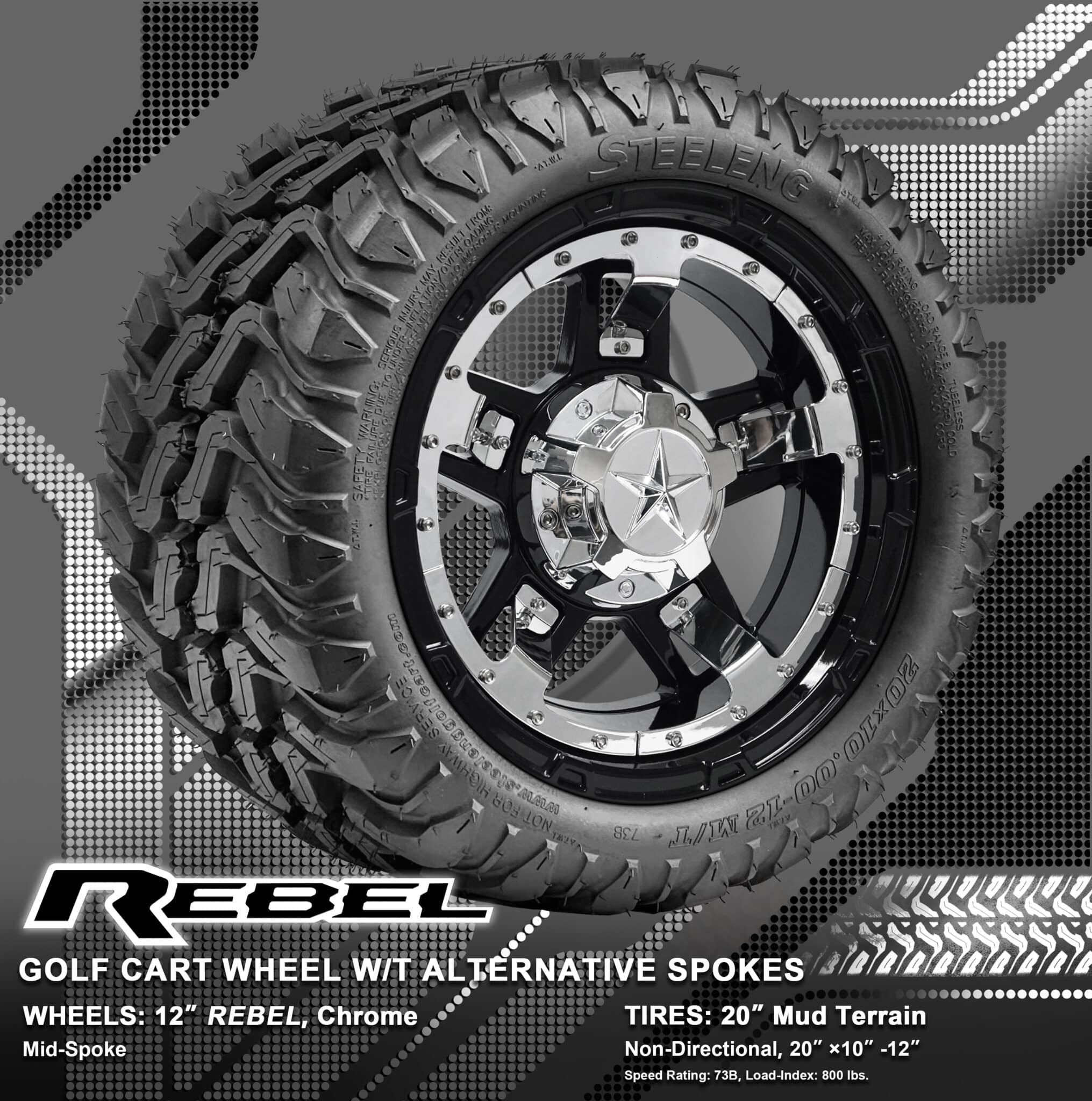 BNDL-TR1202-WH1251-WIRB02-LN0002 – SGC 12″ REBEL Glossy Black Wheel – Aluminum Alloy / STEELENG 20″x10″-12″ Mud Terrain Tire / REBEL Inserts-Mid Spoke-Chrome