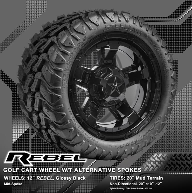 BNDL-TR1202-WH1251-WIRB03-LN0002 – SGC 12″ REBEL Glossy Black Wheel – Aluminum Alloy / STEELENG 20″x10″-12″ Mud Terrain Tire / REBEL Inserts-Mid Spoke-Glossy Black