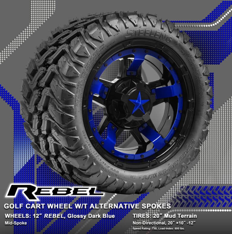 BNDL-TR1202-WH1251-WIRB04-LN0002 – SGC 12″ REBEL Glossy Black Wheel – Aluminum Alloy / STEELENG 20″x10″-12″ Mud Terrain Tire / REBEL Inserts-Mid Spoke-Glossy Dark Blue