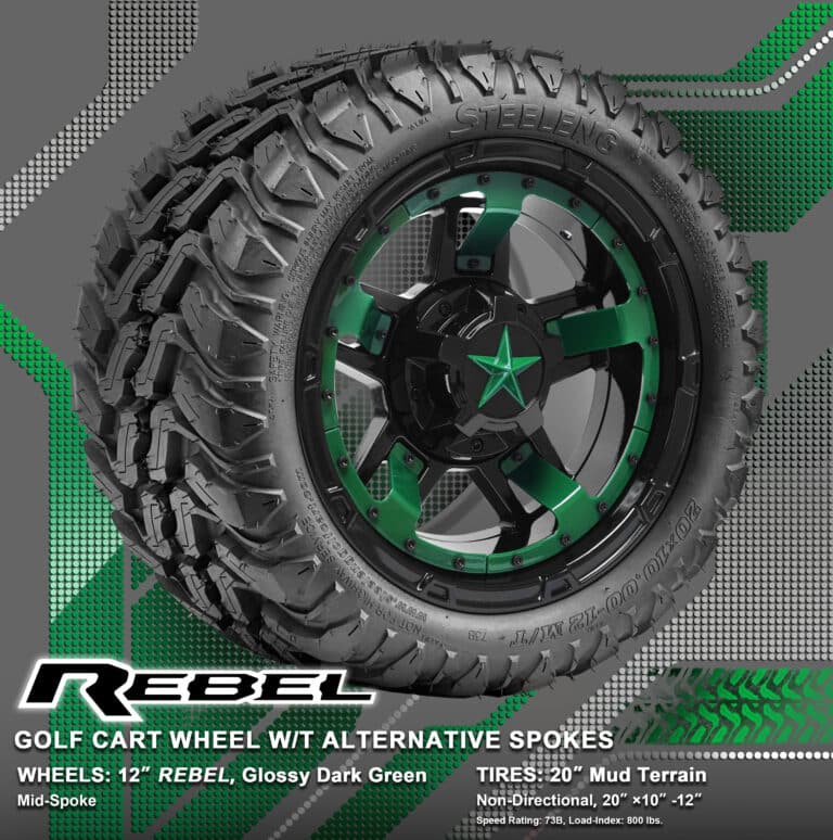 BNDL-TR1202-WH1251-WIRB05-LN0002 – SGC 12″ REBEL Glossy Black Wheel – Aluminum Alloy / STEELENG 20″x10″-12″ Mud Terrain Tire / REBEL Inserts-Mid Spoke-Glossy Dark Green