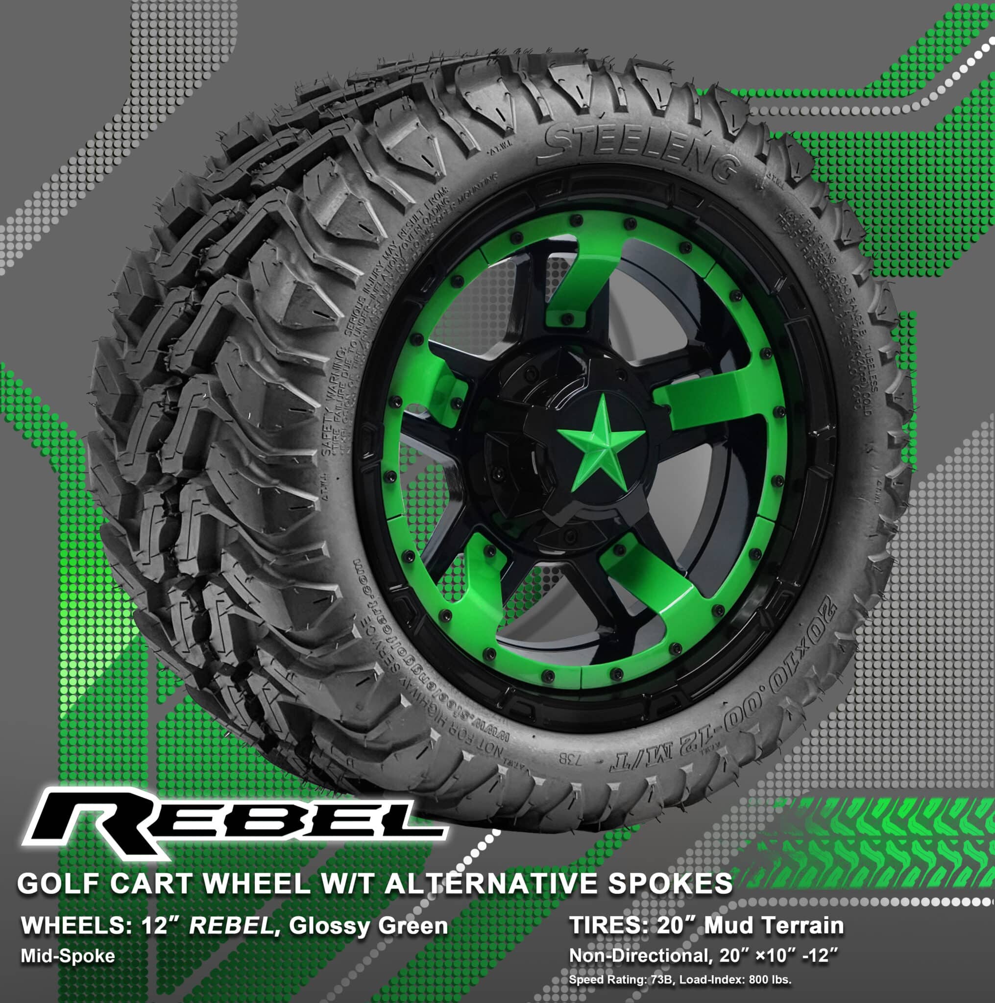 BNDL-TR1202-WH1251-WIRB06-LN0002 – SGC 12″ REBEL Glossy Black Wheel – Aluminum Alloy / STEELENG 20″x10″-12″ Mud Terrain Tire / REBEL Inserts-Mid Spoke-Glossy Green