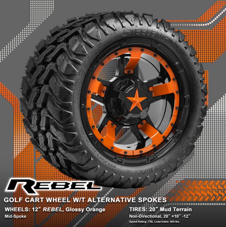 BNDL-TR1202-WH1251-WIRB07-LN0002 – SGC 12″ REBEL Glossy Black Wheel – Aluminum Alloy / STEELENG 20″x10″-12″ Mud Terrain Tire / REBEL Inserts-Mid Spoke-Glossy Orange