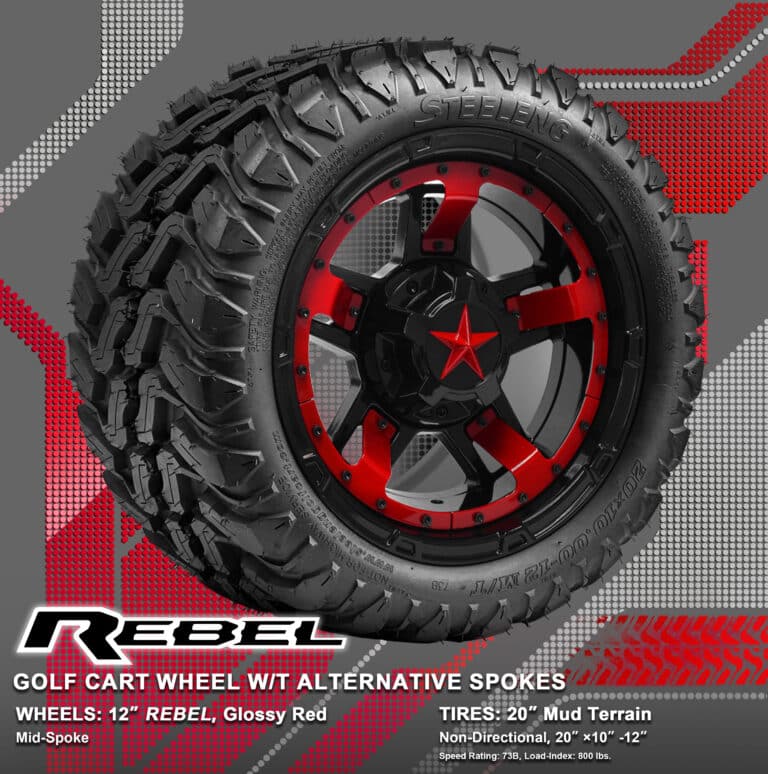 BNDL-TR1202-WH1251-WIRB08-LN0002 – SGC 12″ REBEL Glossy Black Wheel – Aluminum Alloy / STEELENG 20″x10″-12″ Mud Terrain Tire / REBEL Inserts-Mid Spoke-Glossy Red