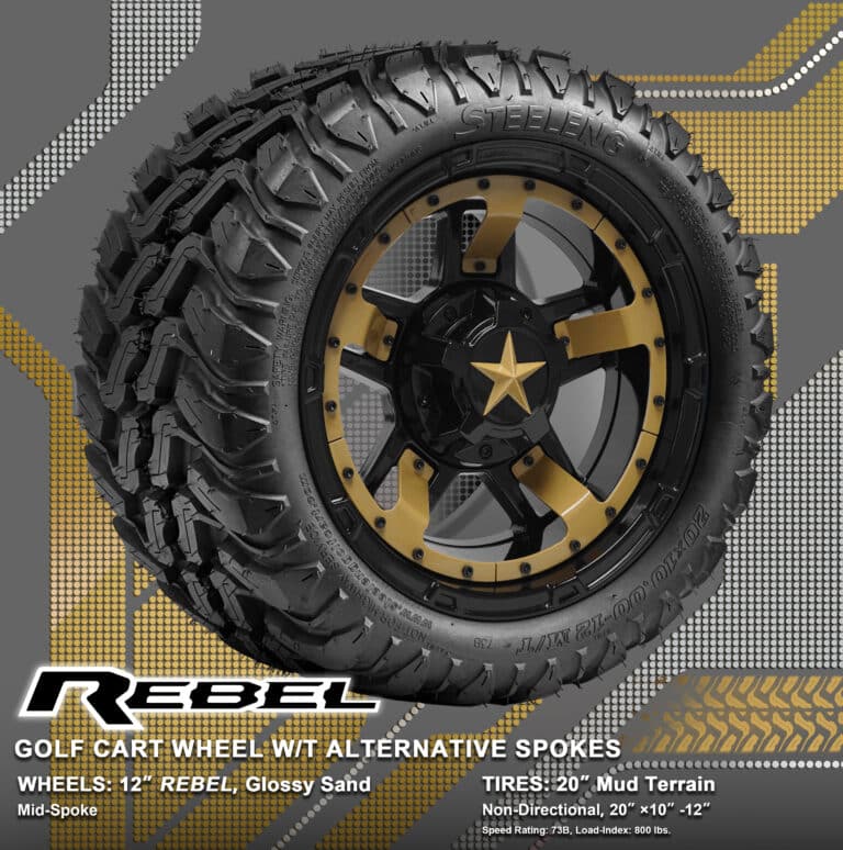 BNDL-TR1202-WH1251-WIRB09-LN0002 – SGC 12″ REBEL Glossy Black Wheel – Aluminum Alloy / STEELENG 20″x10″-12″ Mud Terrain Tire / REBEL Inserts-Mid Spoke-Glossy Sand