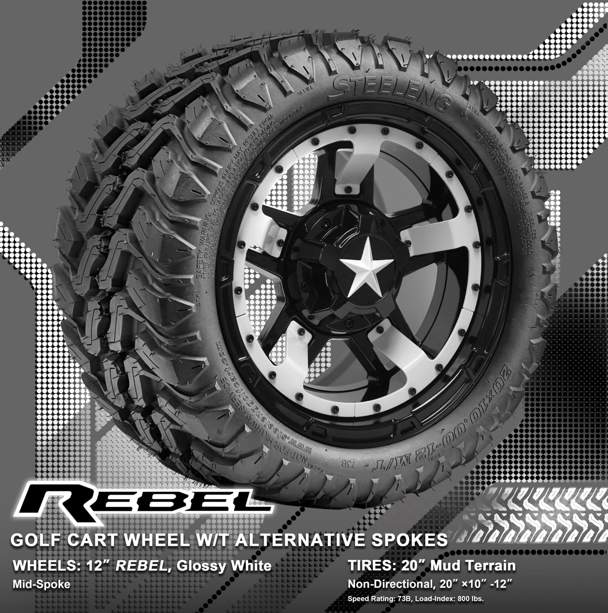 BNDL-TR1202-WH1251-WIRB10-LN0002 – SGC 12″ REBEL Glossy Black Wheel – Aluminum Alloy / STEELENG 20″x10″-12″ Mud Terrain Tire / REBEL Inserts-Mid Spoke-Glossy White