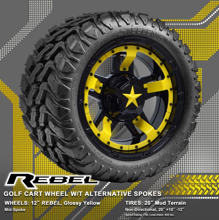 BNDL-TR1202-WH1251-WIRB11-LN0002 – SGC 12″ REBEL Glossy Black Wheel – Aluminum Alloy / STEELENG 20″x10″-12″ Mud Terrain Tire / REBEL Inserts-Mid Spoke-Glossy Yellow