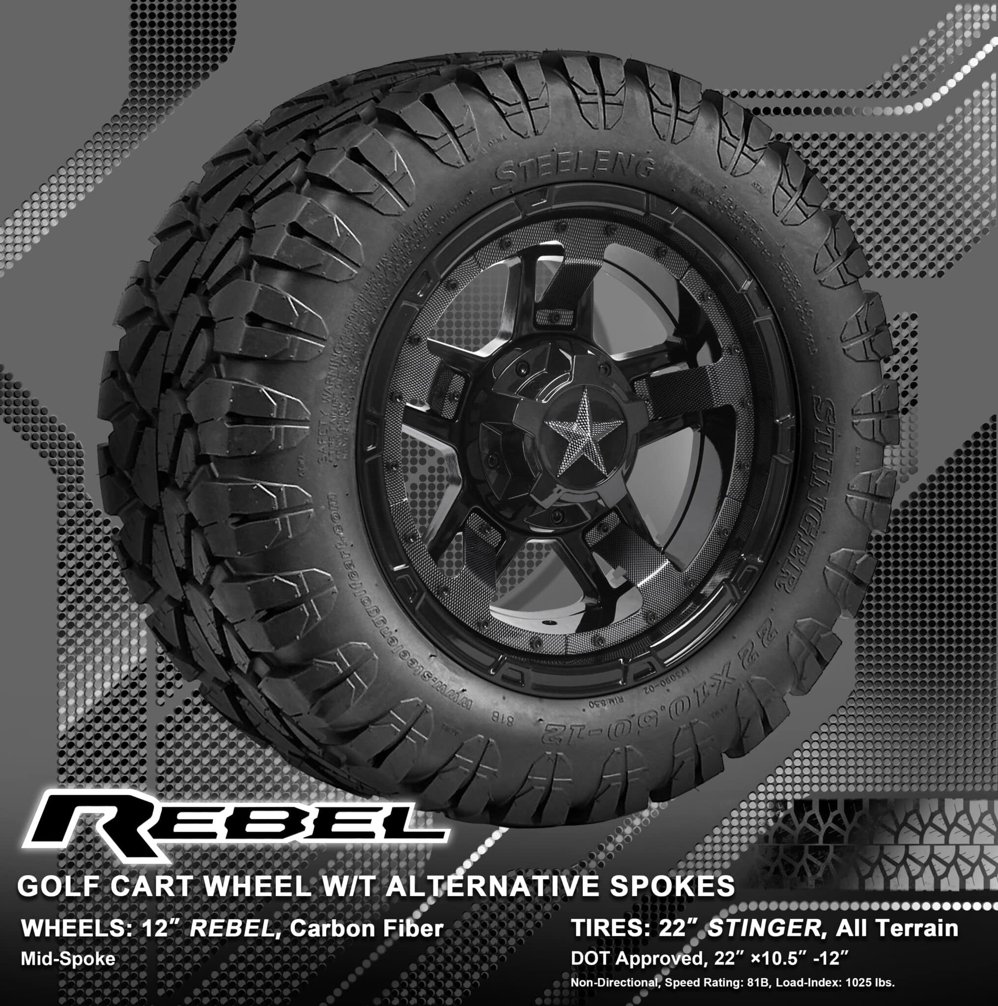 BNDL-TR1203-WH1251-WIRB01-LN0002 – SGC 12″ REBEL Glossy Black Wheel – Aluminum Alloy / STEELENG 22″x10.5″-12″ STINGER All Terrain Tire DOT approved / REBEL Inserts-Mid Spoke-Carbon Fiber