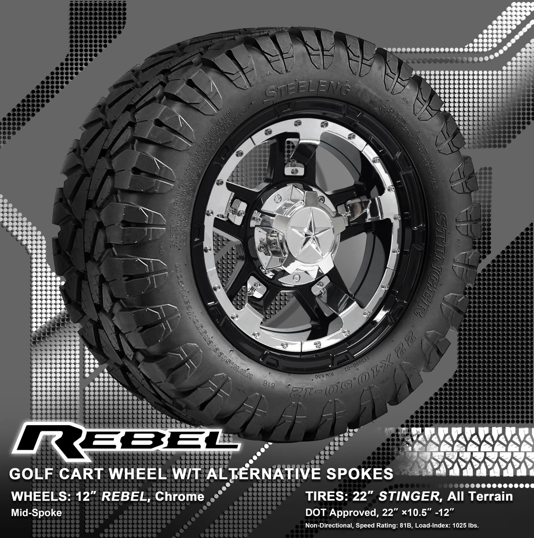 BNDL-TR1203-WH1251-WIRB02-LN0002 – SGC 12″ REBEL Glossy Black Wheel – Aluminum Alloy / STEELENG 22″x10.5″-12″ STINGER All Terrain Tire DOT approved / REBEL Inserts-Mid Spoke-Chrome
