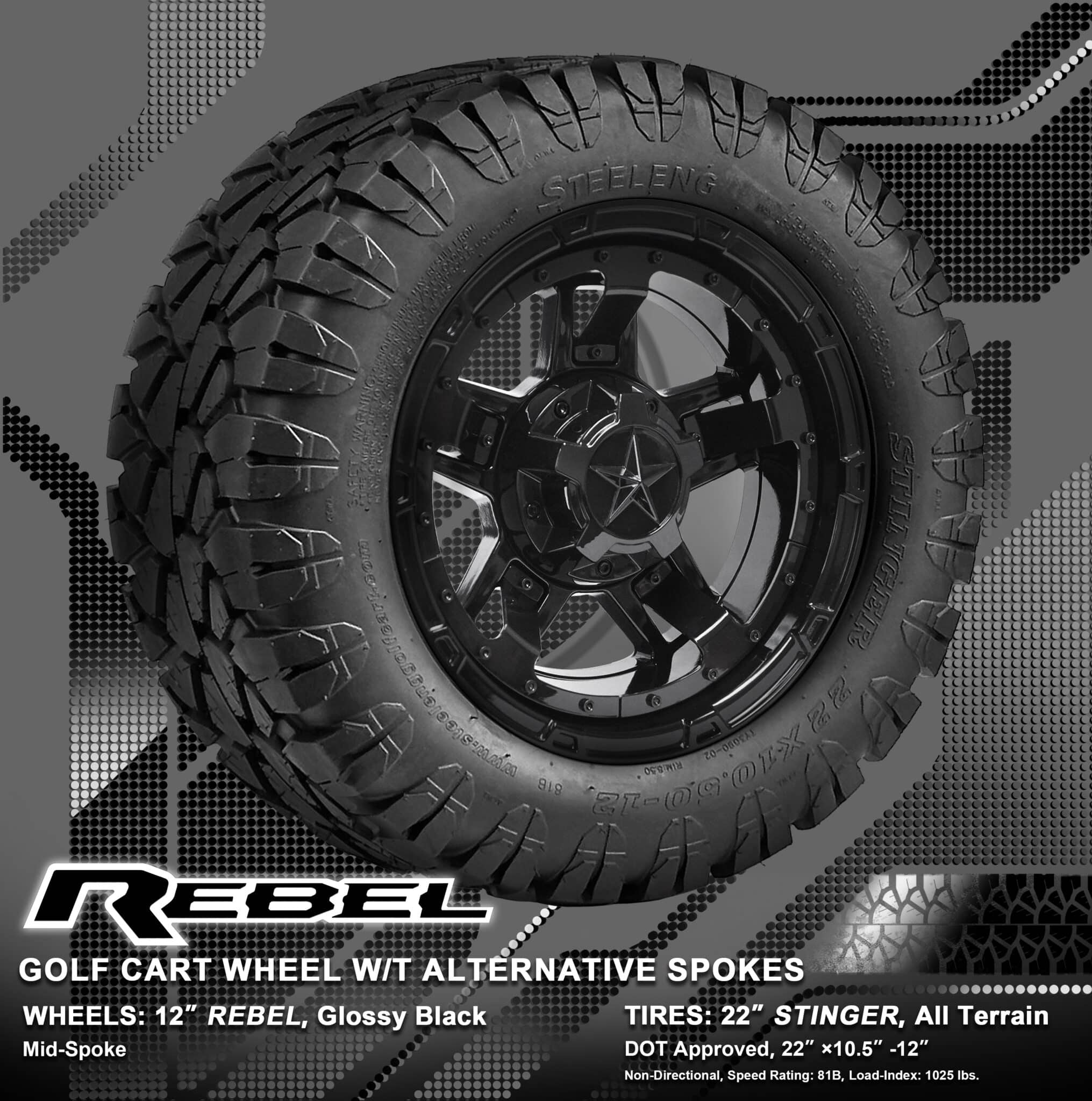 BNDL-TR1203-WH1251-WIRB03-LN0002 – SGC 12″ REBEL Glossy Black Wheel – Aluminum Alloy / STEELENG 22″x10.5″-12″ STINGER All Terrain Tire DOT approved / REBEL Inserts-Mid Spoke-Glossy Black