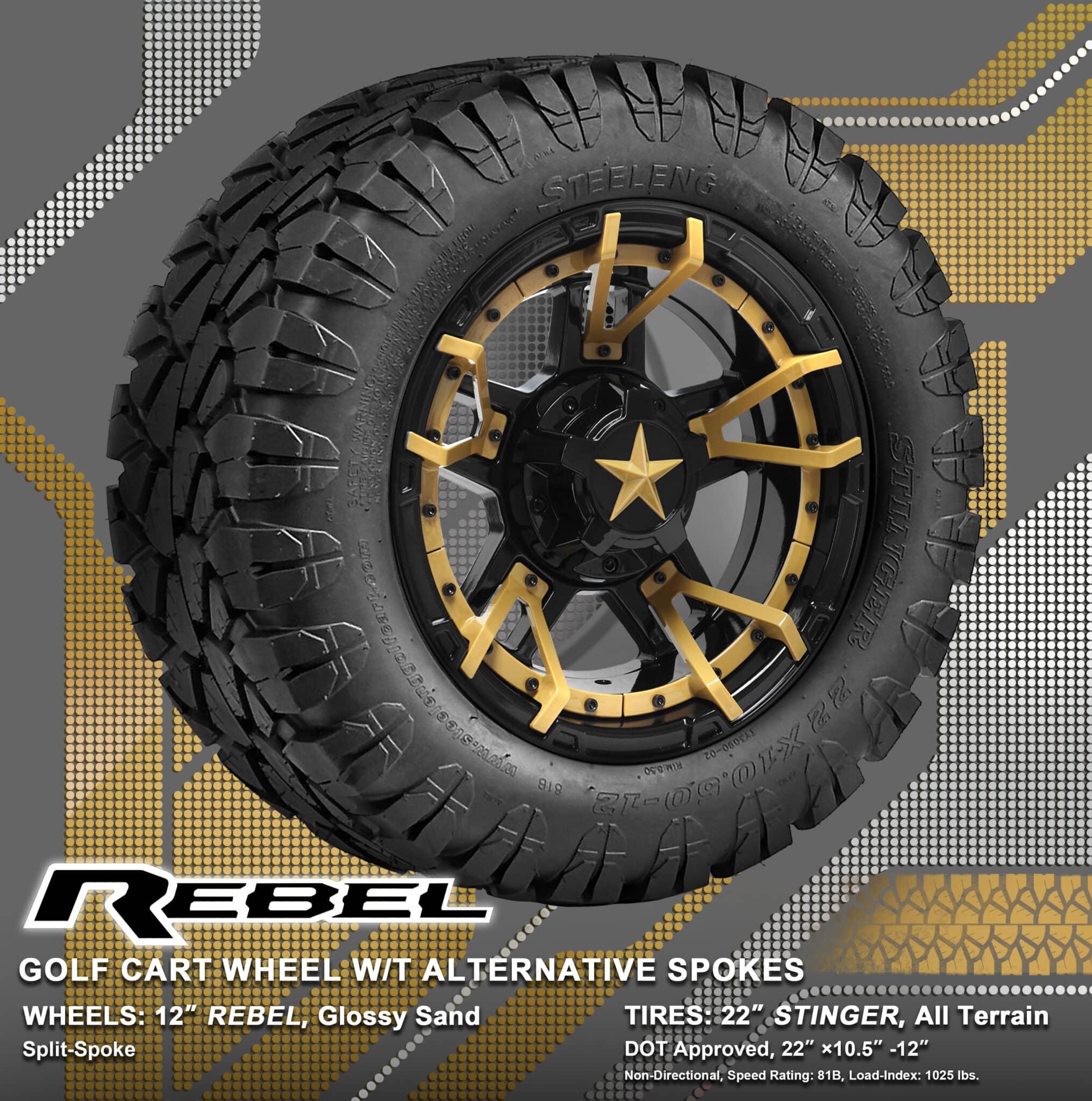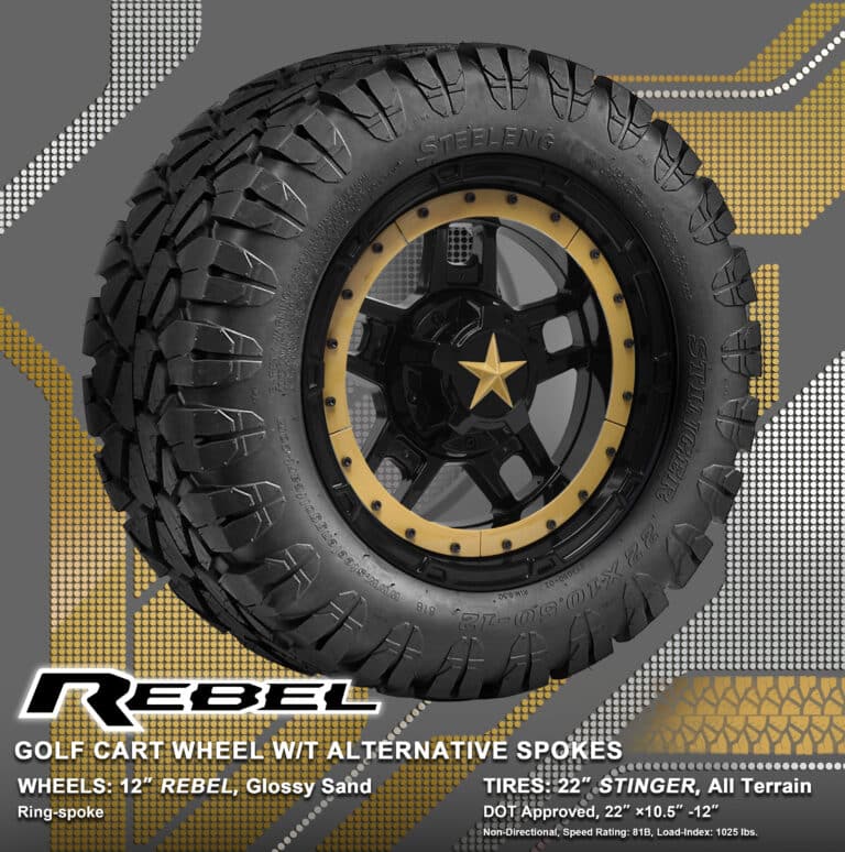 BNDL-TR1203-WH1251-WIRB35-LN0002 – SGC 12″ REBEL Glossy Black Wheel – Aluminum Alloy / STEELENG 22″x10.5″-12″ STINGER All Terrain Tire DOT approved / REBEL Inserts-Split Spoke-Glossy Sand
