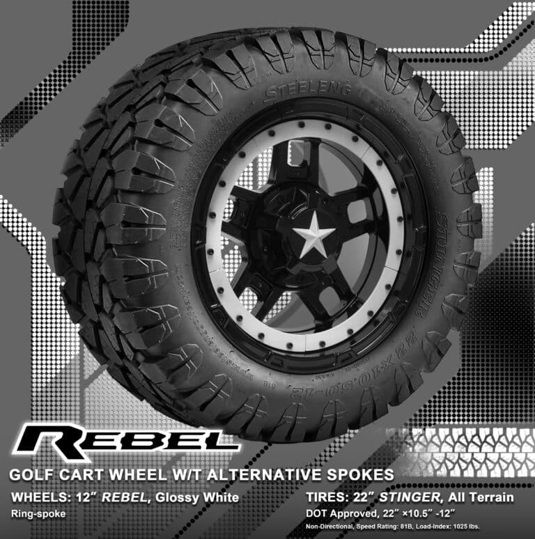 BNDL-TR1203-WH1251-WIRB36-LN0002 – SGC 12″ REBEL Glossy Black Wheel – Aluminum Alloy / STEELENG 22″x10.5″-12″ STINGER All Terrain Tire DOT approved / REBEL Inserts-Split Spoke-Glossy White