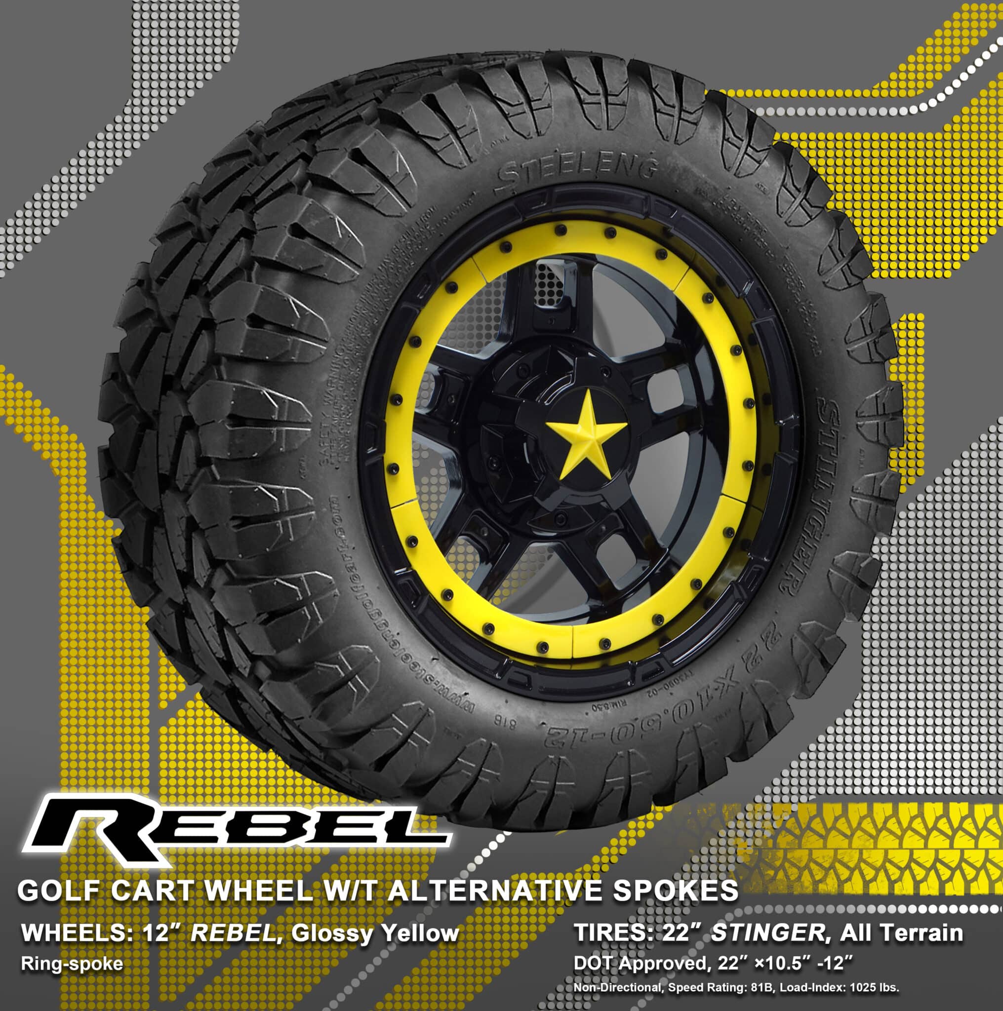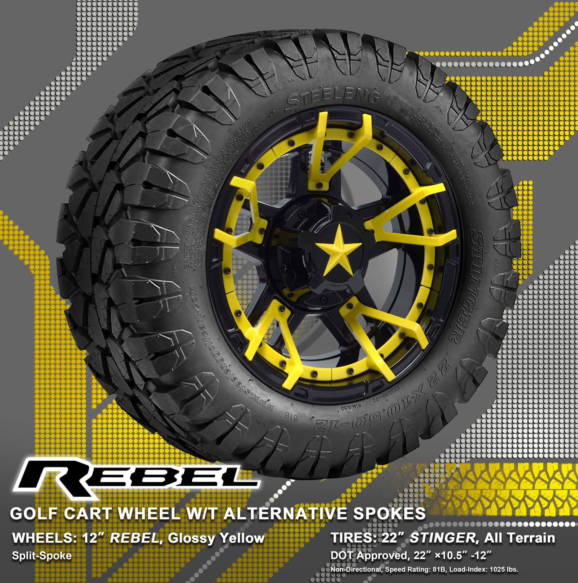 BNDL-TR1203-WH1251-WIRB37-LN0002 – SGC 12″ REBEL Glossy Black Wheel – Aluminum Alloy / STEELENG 22″x10.5″-12″ STINGER All Terrain Tire DOT approved / REBEL Inserts-Split Spoke-Glossy Yellow