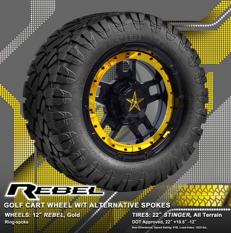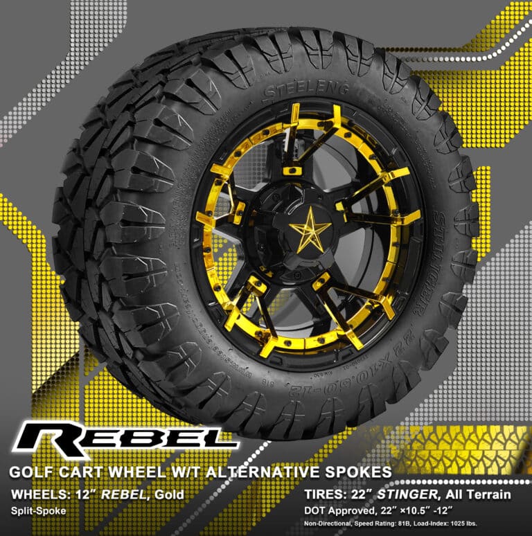 BNDL-TR1203-WH1251-WIRB38-LN0002 – SGC 12″ REBEL Glossy Black Wheel – Aluminum Alloy / STEELENG 22″x10.5″-12″ STINGER All Terrain Tire DOT approved / REBEL Inserts-Split Spoke-Gold