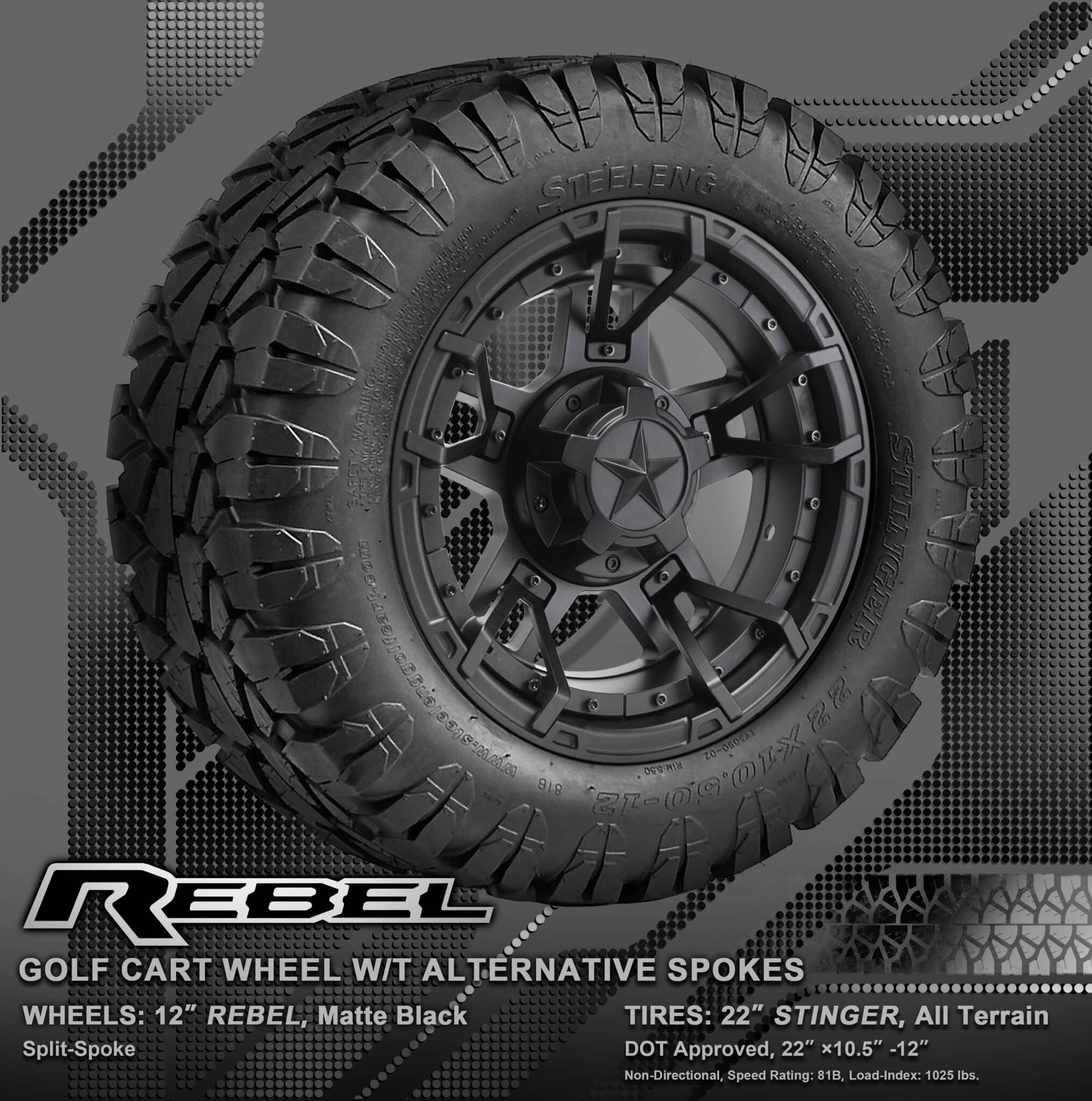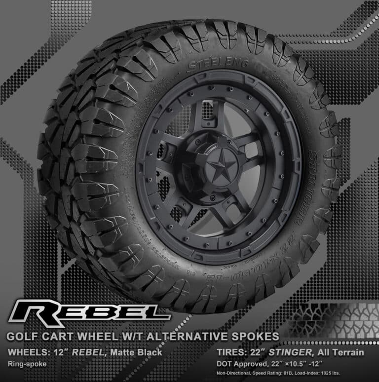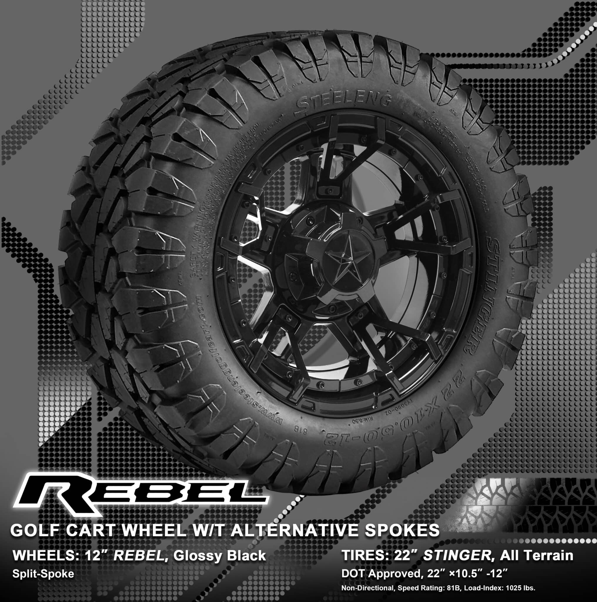 BNDL-TR1203-WH1251-WIRB39-LN0002 – SGC 12″ REBEL Glossy Black Wheel – Aluminum Alloy / STEELENG 22″x10.5″-12″ STINGER All Terrain Tire DOT approved / REBEL Inserts-Split Spoke-Matte Black