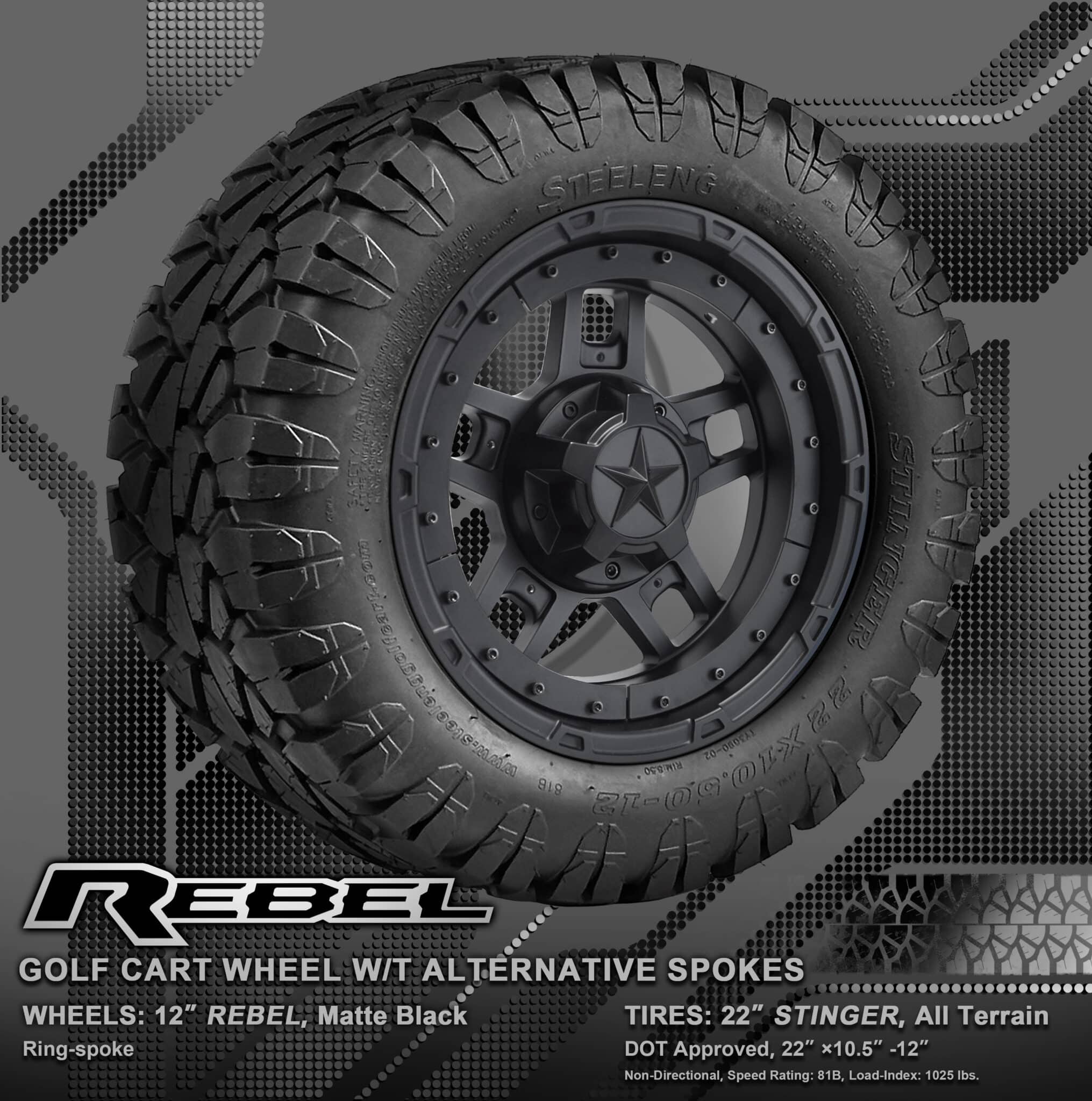 BNDL-TR1203-WH1251-WIRB26-LN0002 – SGC 12″ REBEL Glossy Black Wheel – Aluminum Alloy / STEELENG 22″x10.5″-12″ STINGER All Terrain Tire DOT approved / REBEL Inserts-Ring-Matte Black