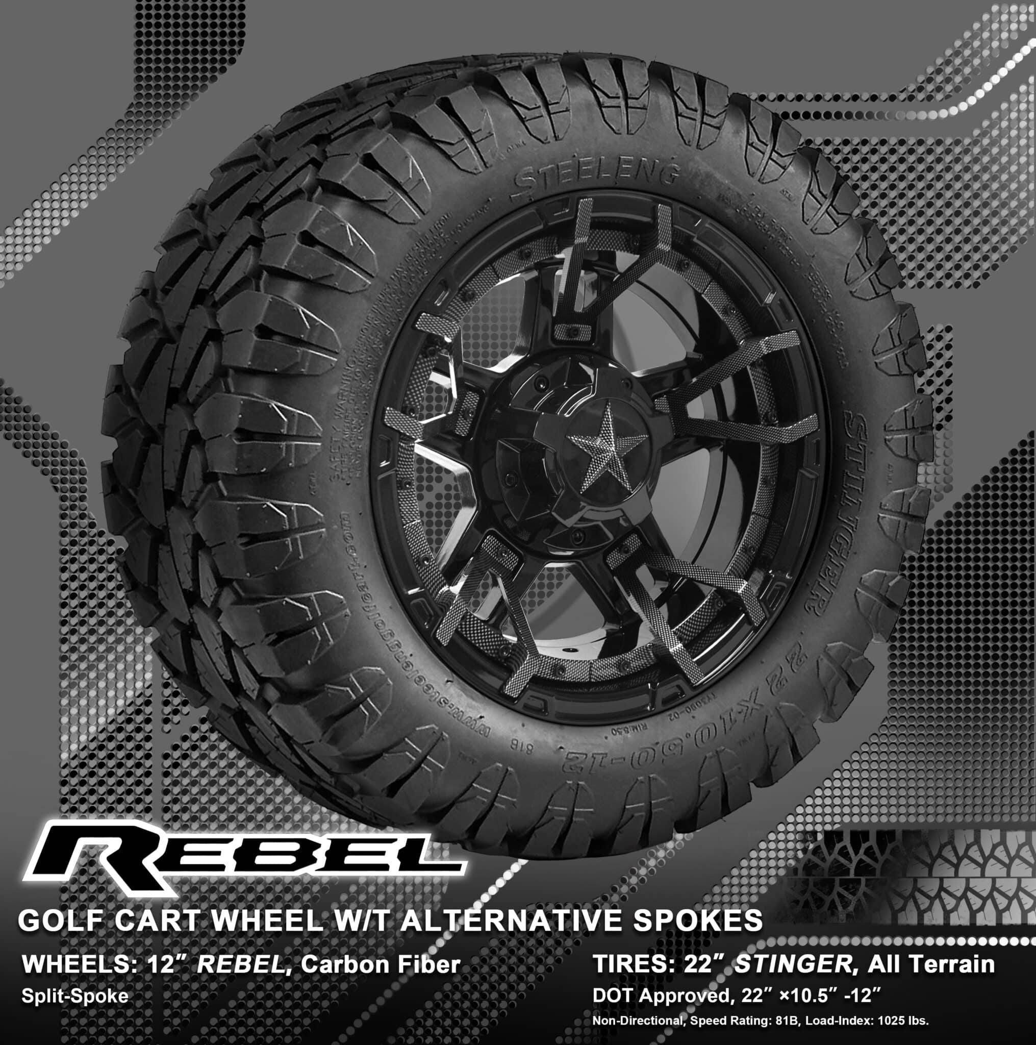 BNDL-TR1203-WH1251-WIRB27-LN0002 – SGC 12″ REBEL Glossy Black Wheel – Aluminum Alloy / STEELENG 22″x10.5″-12″ STINGER All Terrain Tire DOT approved / REBEL Inserts-Split Spoke-Carbon Fiber