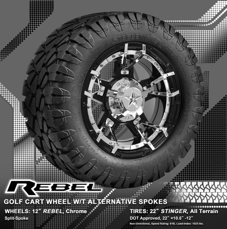 BNDL-TR1203-WH1251-WIRB28-LN0002 – SGC 12″ REBEL Glossy Black Wheel – Aluminum Alloy / STEELENG 22″x10.5″-12″ STINGER All Terrain Tire DOT approved / REBEL Inserts-Split Spoke-Chrome