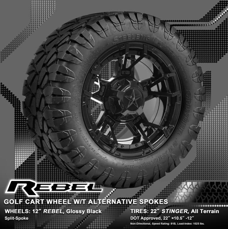 BNDL-TR1203-WH1251-WIRB29-LN0002 – SGC 12″ REBEL Glossy Black Wheel – Aluminum Alloy / STEELENG 22″x10.5″-12″ STINGER All Terrain Tire DOT approved / REBEL Inserts-Split Spoke-Glossy Black