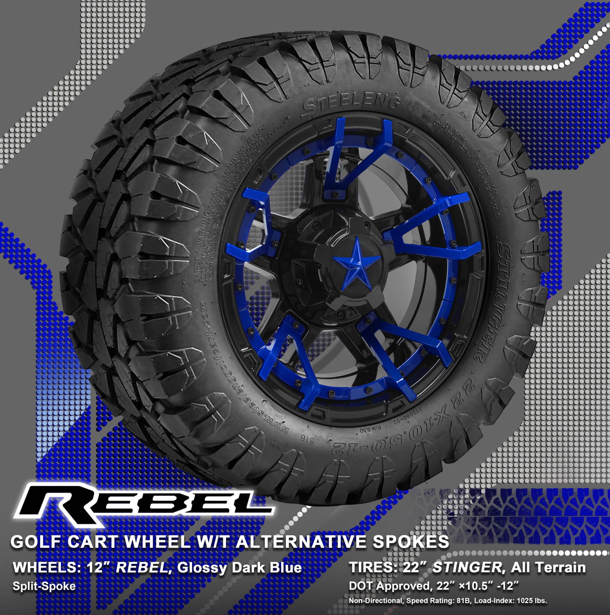 BNDL-TR1203-WH1251-WIRB30-LN0002 – SGC 12″ REBEL Glossy Black Wheel – Aluminum Alloy / STEELENG 22″x10.5″-12″ STINGER All Terrain Tire DOT approved / REBEL Inserts-Split Spoke-Glossy Dark Blue