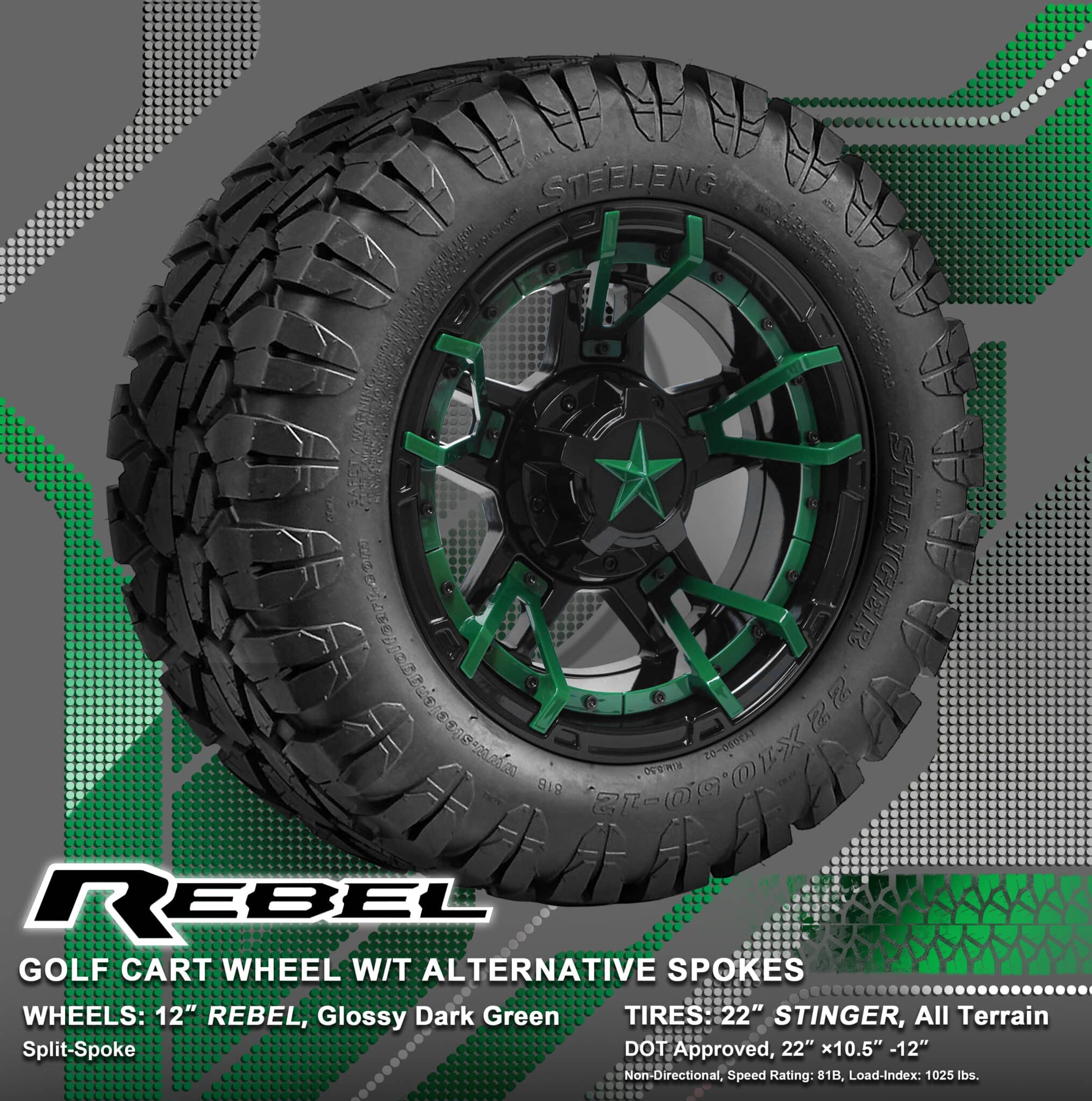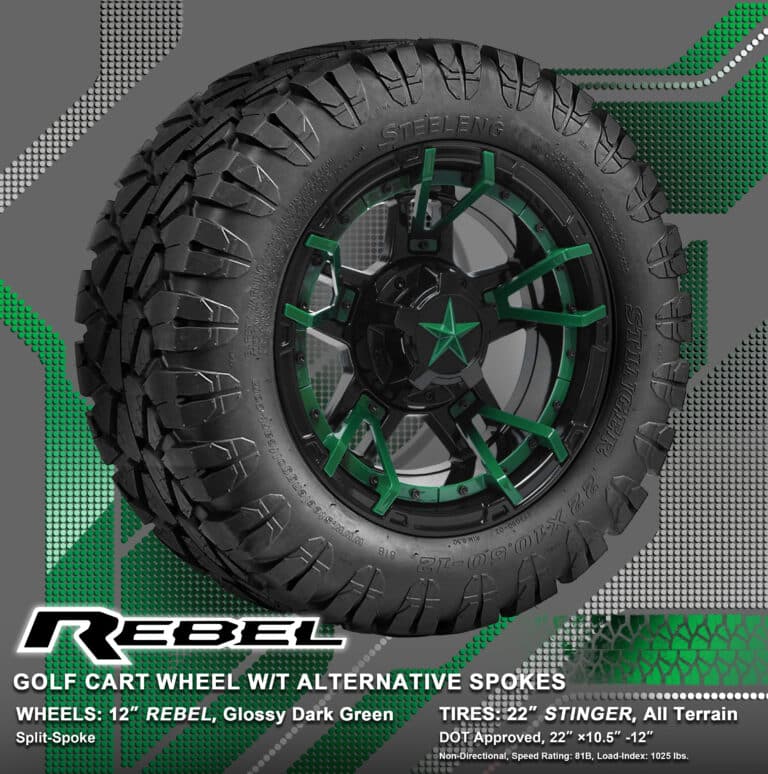BNDL-TR1203-WH1251-WIRB31-LN0002 – SGC 12″ REBEL Glossy Black Wheel – Aluminum Alloy / STEELENG 22″x10.5″-12″ STINGER All Terrain Tire DOT approved / REBEL Inserts-Split Spoke-Glossy Dark Green