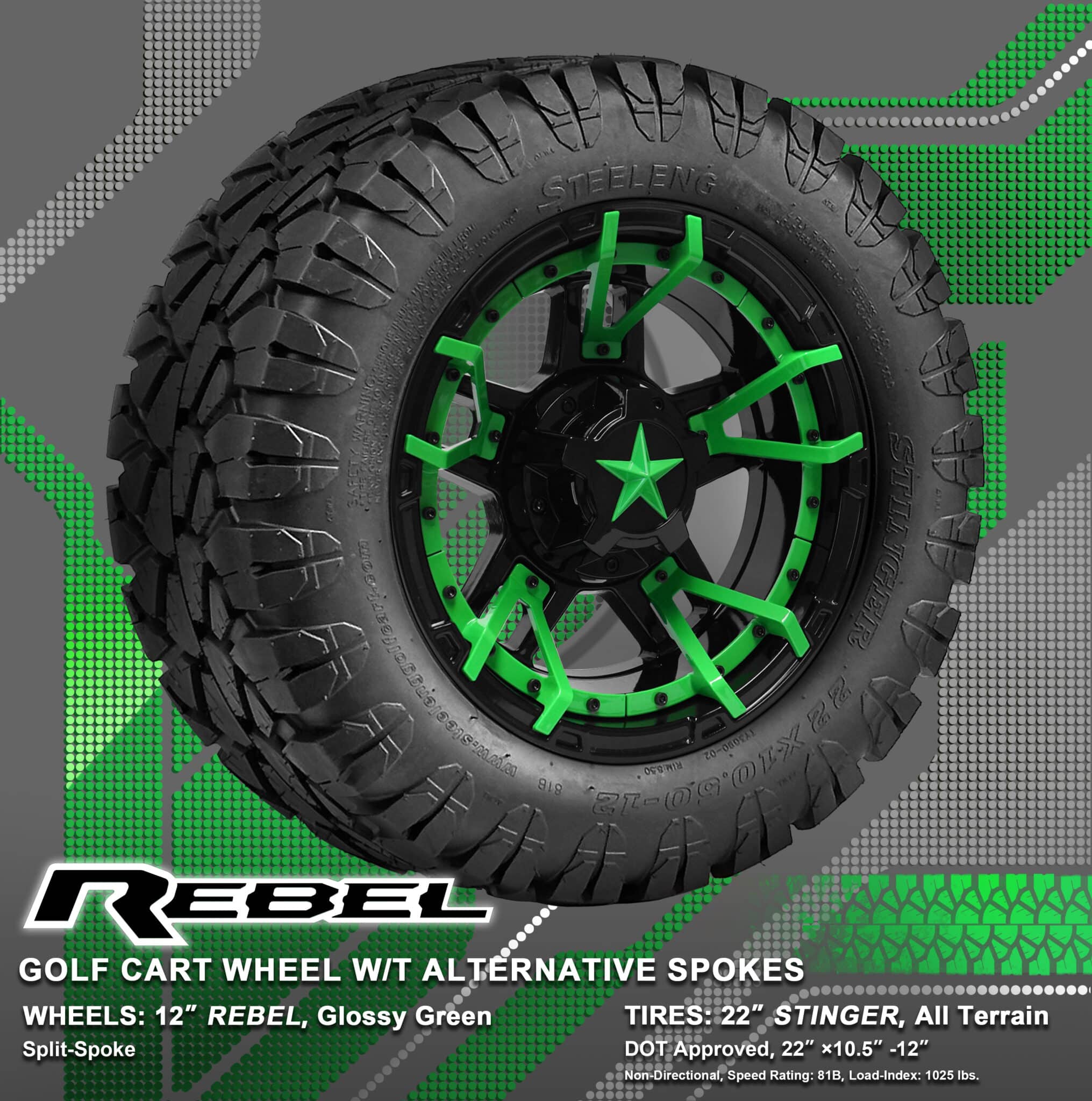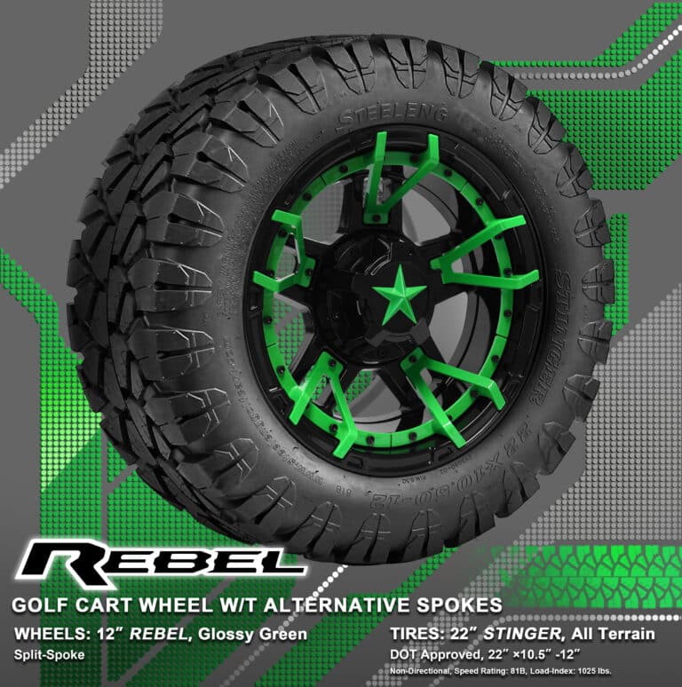 BNDL-TR1203-WH1251-WIRB32-LN0002 – SGC 12″ REBEL Glossy Black Wheel – Aluminum Alloy / STEELENG 22″x10.5″-12″ STINGER All Terrain Tire DOT approved / REBEL Inserts-Split Spoke-Glossy Green